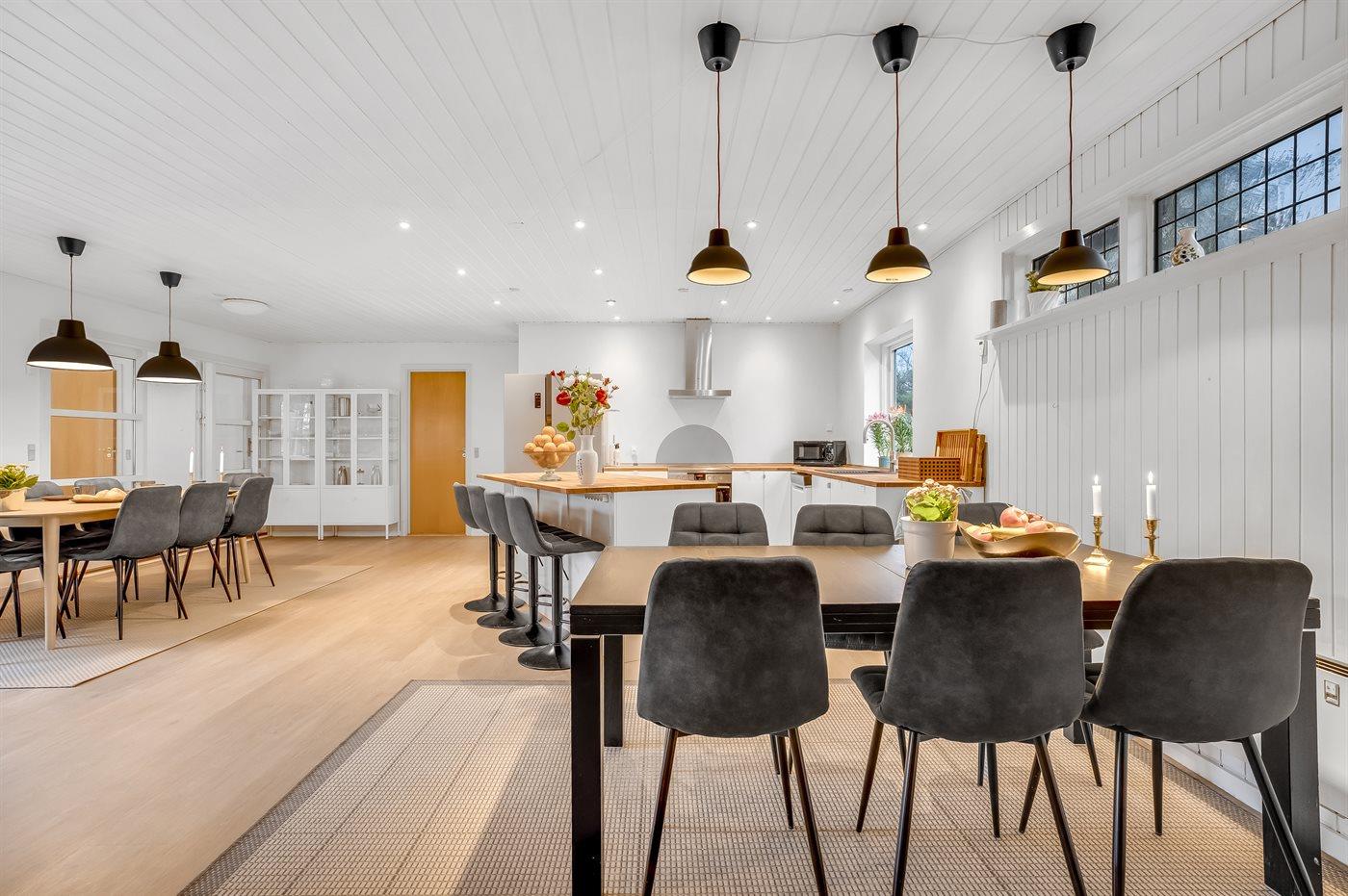 Men lad os tage det fra starten... Indgang til huset sker fra husets nordlige side via bryggerset, som fører ind til et helt nyt køkken-alrum med masser af plads og 14 spisepladser, køkken-ø med bar samt lounge sofa.