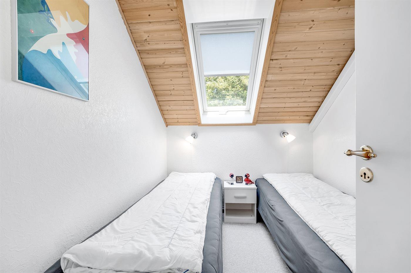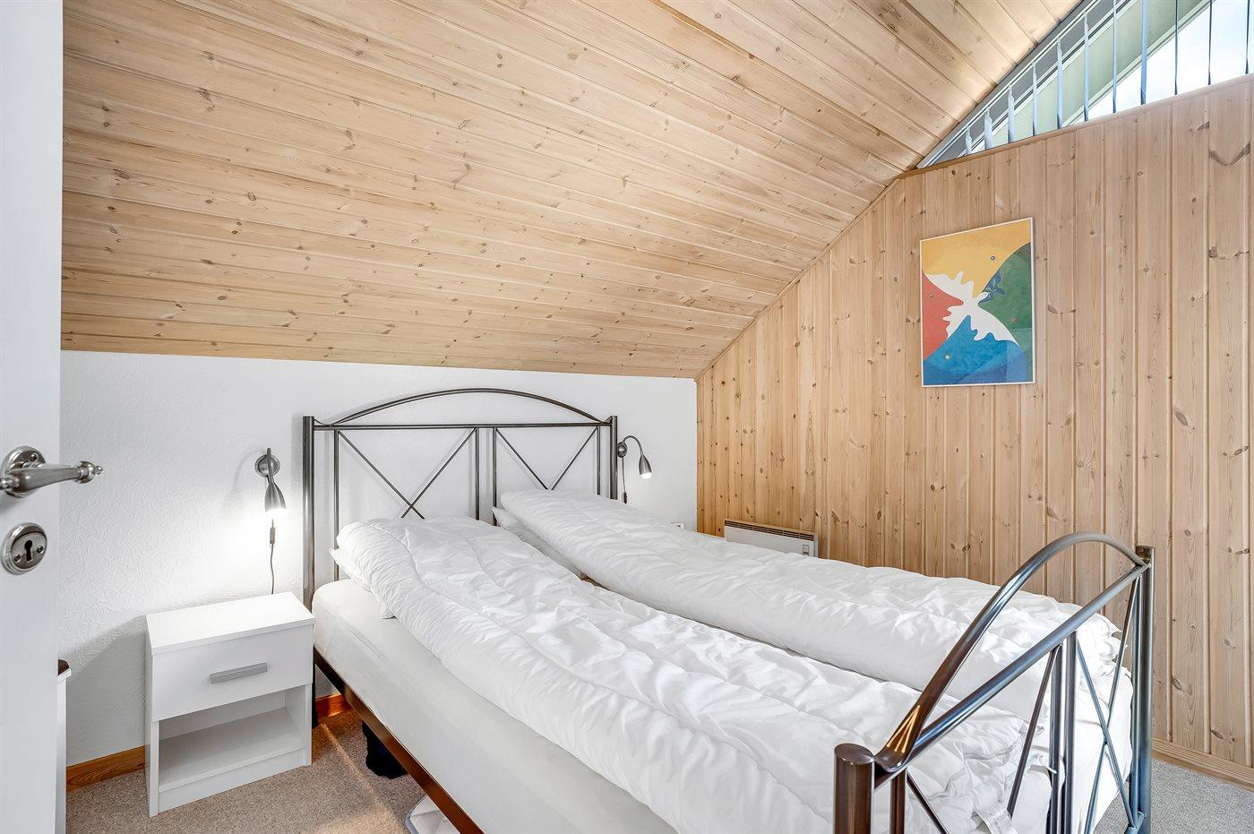 Der er i alt 2 soveværelser. Sovepladserne fordeler sig på: 2 sovepladser i dobbeltseng. 2 sovepladser i enkeltsenge. Derudover er der 1 stk. barneseng.