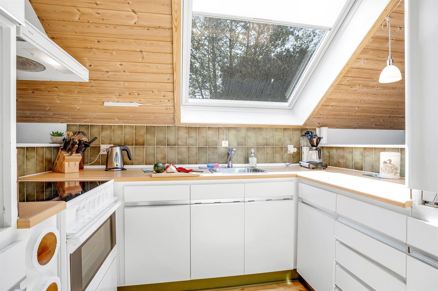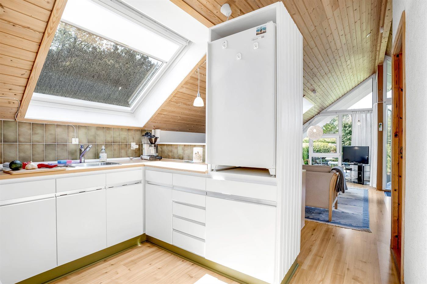 Køkkenet er udstyret med 1 køleskab. Der er 4 keramiske kogeplader, varmluftovn, mikrobølgeovn.