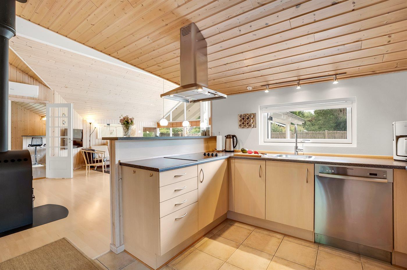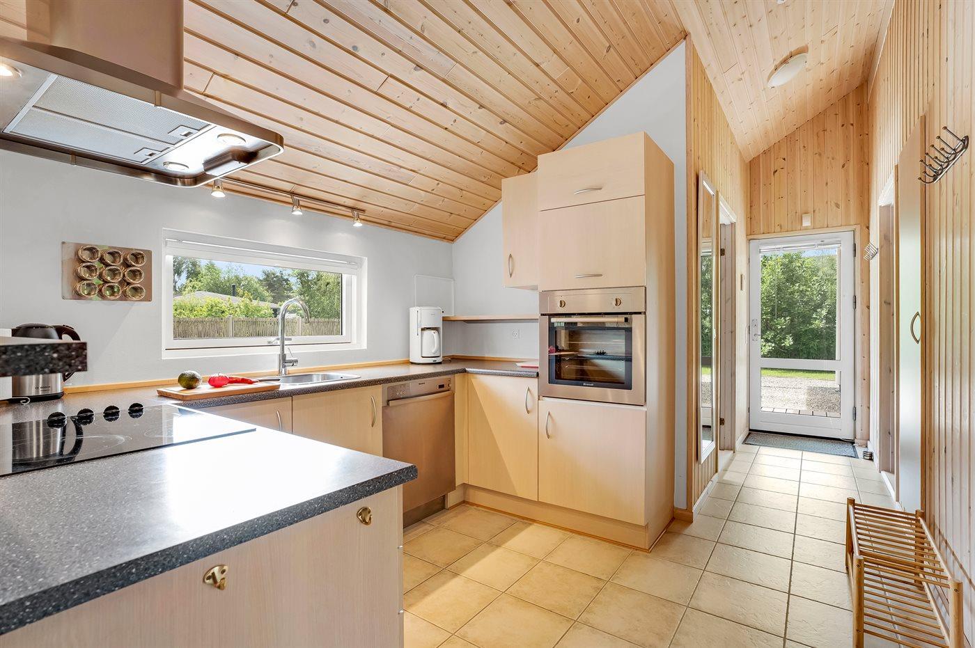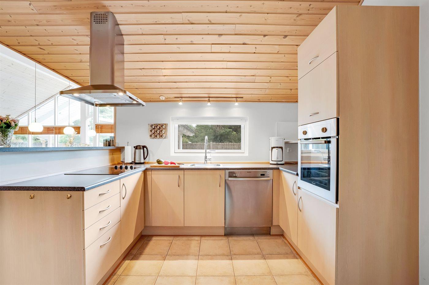 Køkkenet er udstyret med 1 køleskab. Der er 4 keramiske kogeplader, varmluftovn, mikrobølgeovn samt opvaskemaskine.