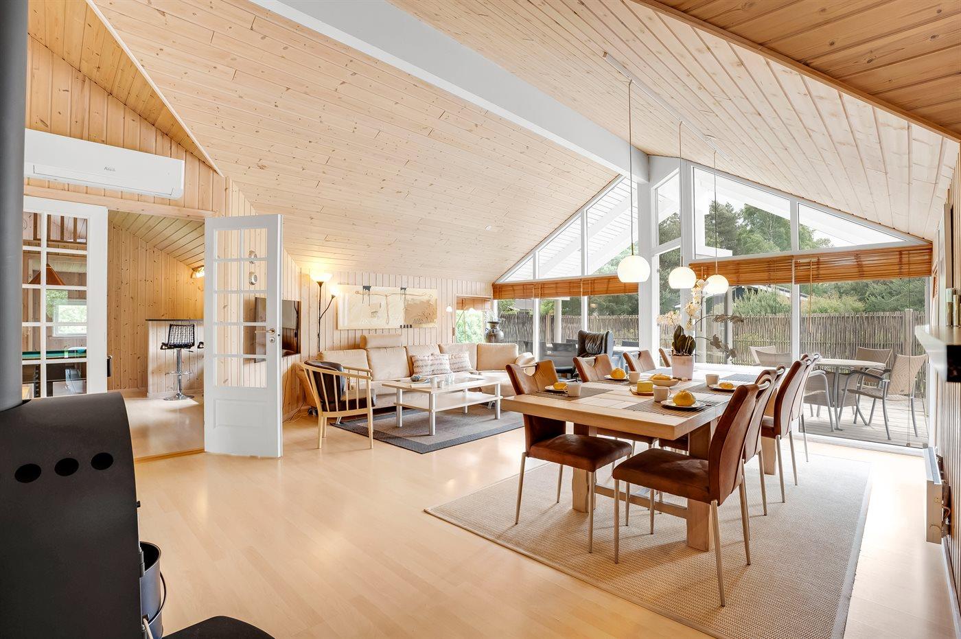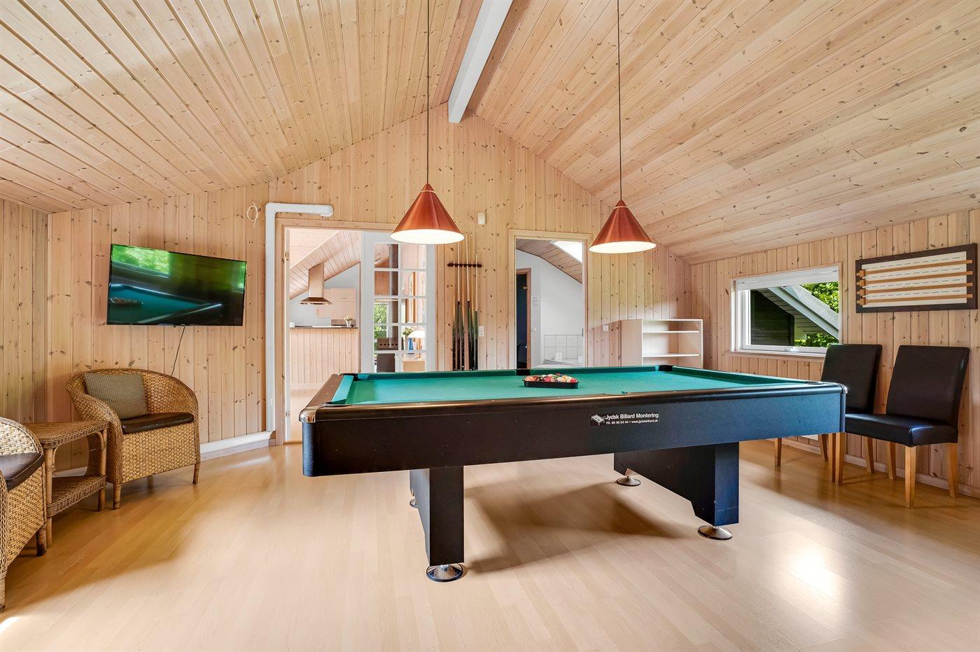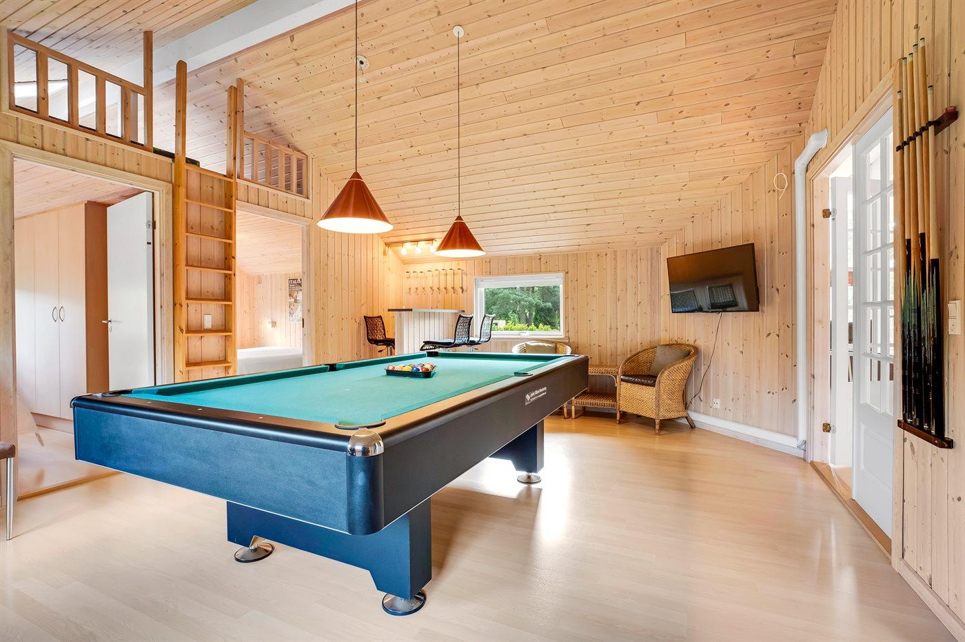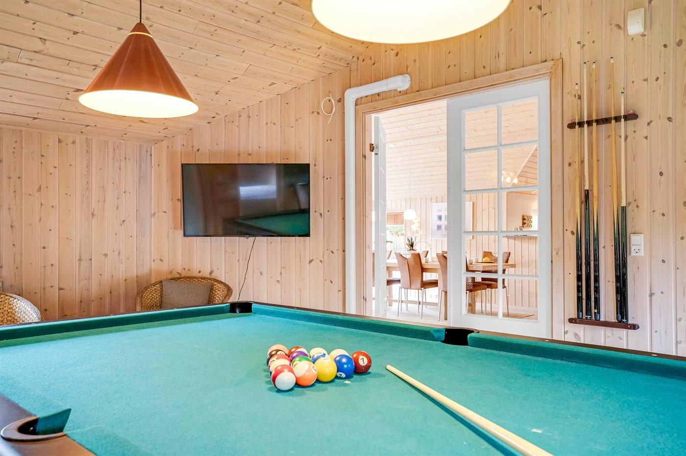 Sommerhuset har ydermere en skøn stor, lukket og overdækket terrasse med masser af plads til at sole sig, grille og hygge i mange timer. På grunden er der desuden fodboldmål. Aktivitetsrummet byder på billard, dart og poolbord, hvor man kan more sig med venner og familie.
