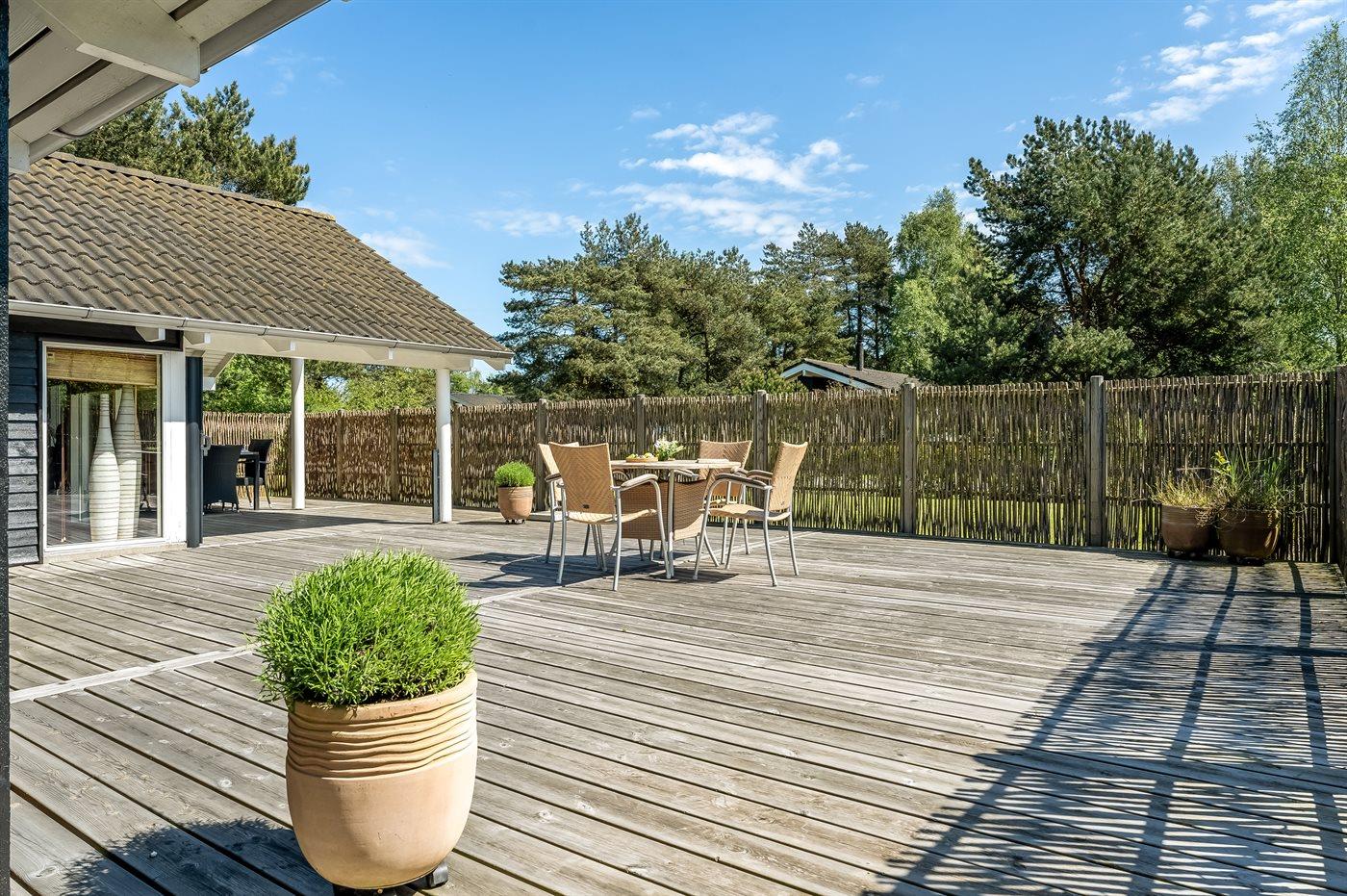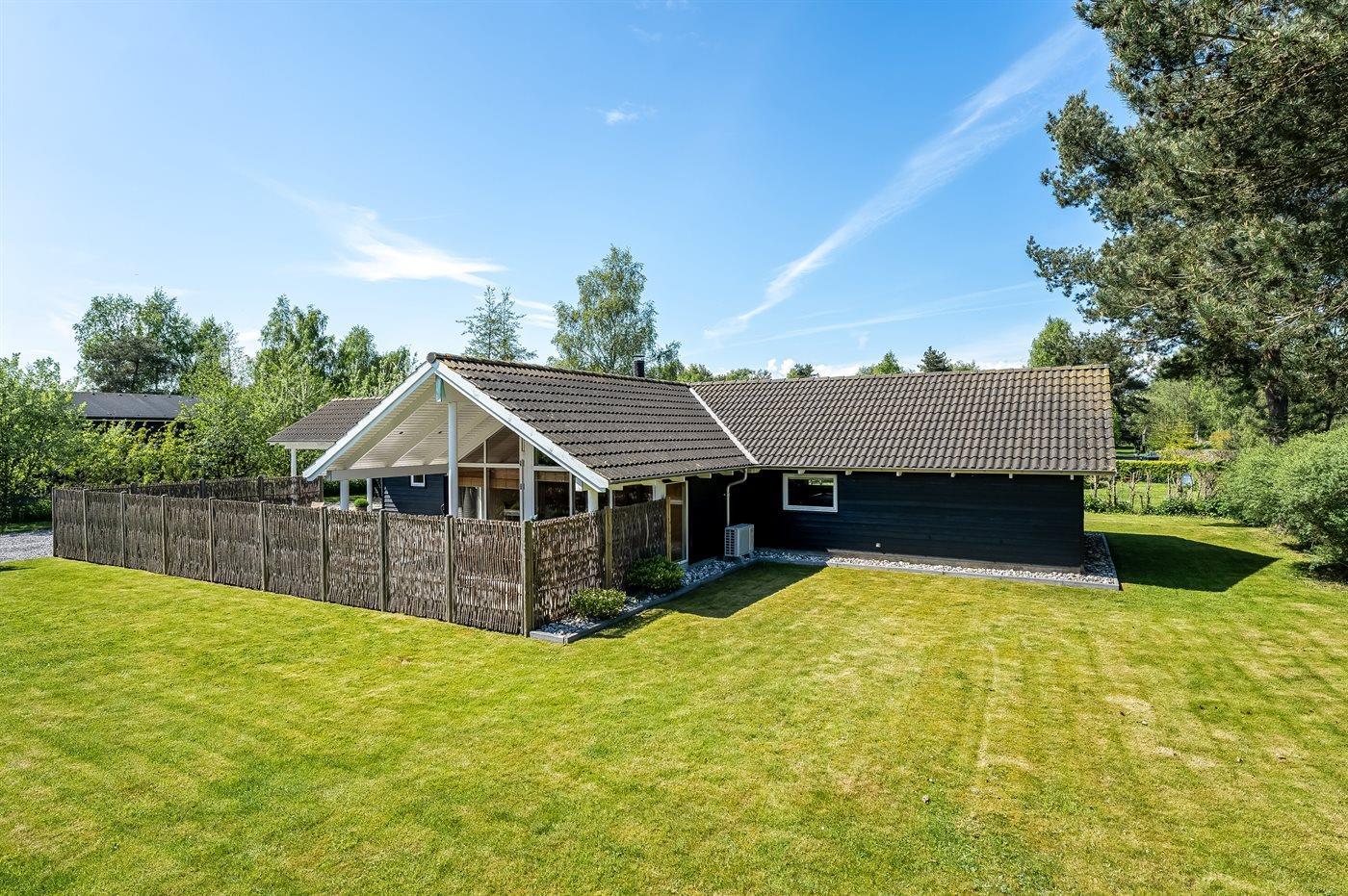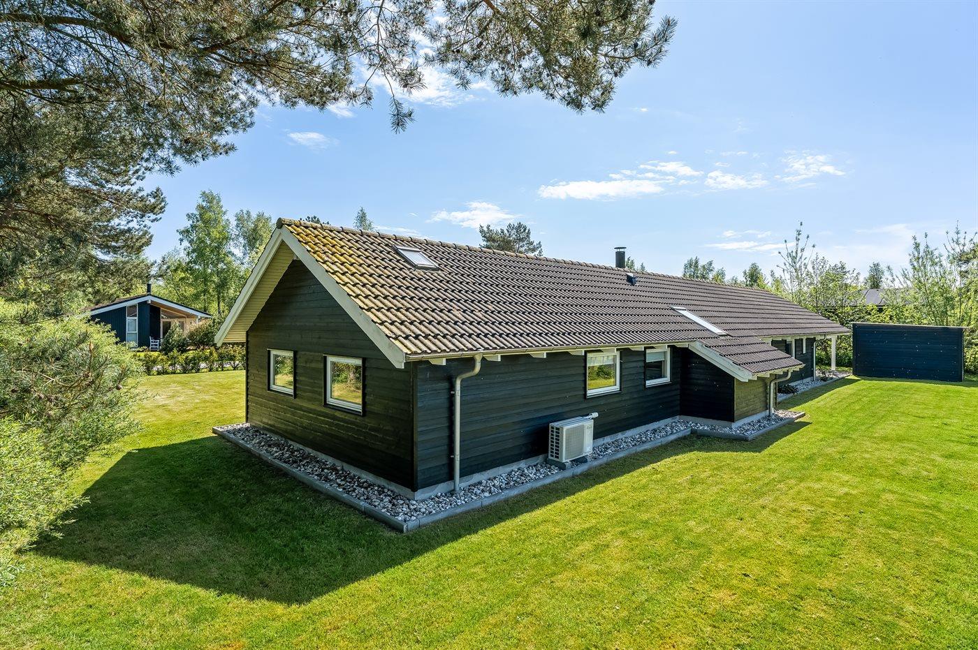 Ferieboligen er beliggende på en 950 m² stor naturgrund. Der er 1000 m til havet. Nærmeste forretning er beliggende i en afstand af 400 m. Til ferieboligen hører åbent terrasseareal. Desuden er der overdækket terrasse. Fodboldmål. Grill til rådighed. Der er garage til rådighed. Parkering ved ferieboligen.