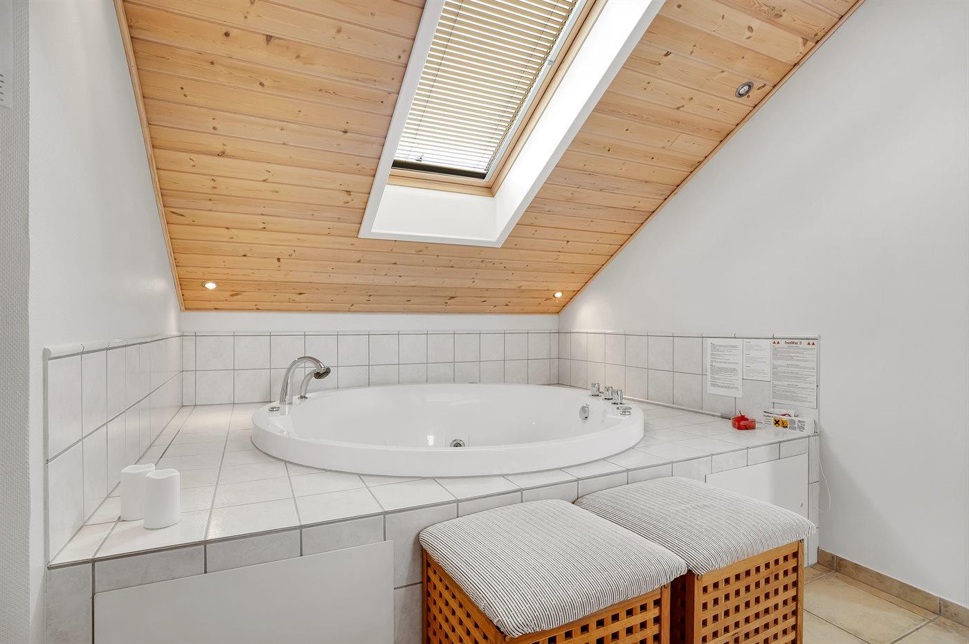 Der er 2 badeværelser med bruseniche og 2 toiletter. Der er gulvvarme på 2 badeværelser. I saunaen er der mulighed for afslapning.