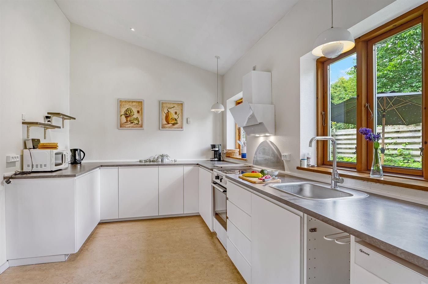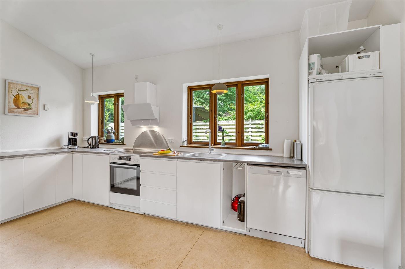 Køkkenet er udstyret med 1 køleskab. Der er 4 keramiske kogeplader, varmluftovn, mikrobølgeovn samt opvaskemaskine Der er gulvvarme i køkkenet.