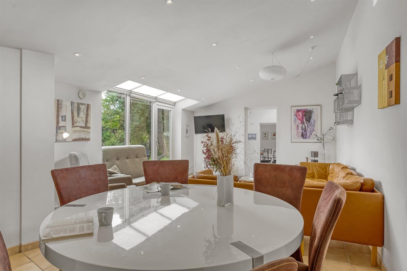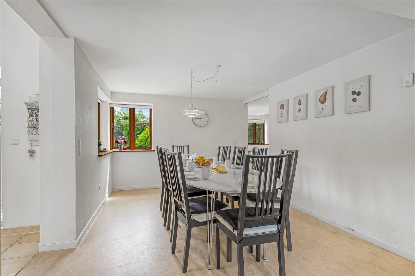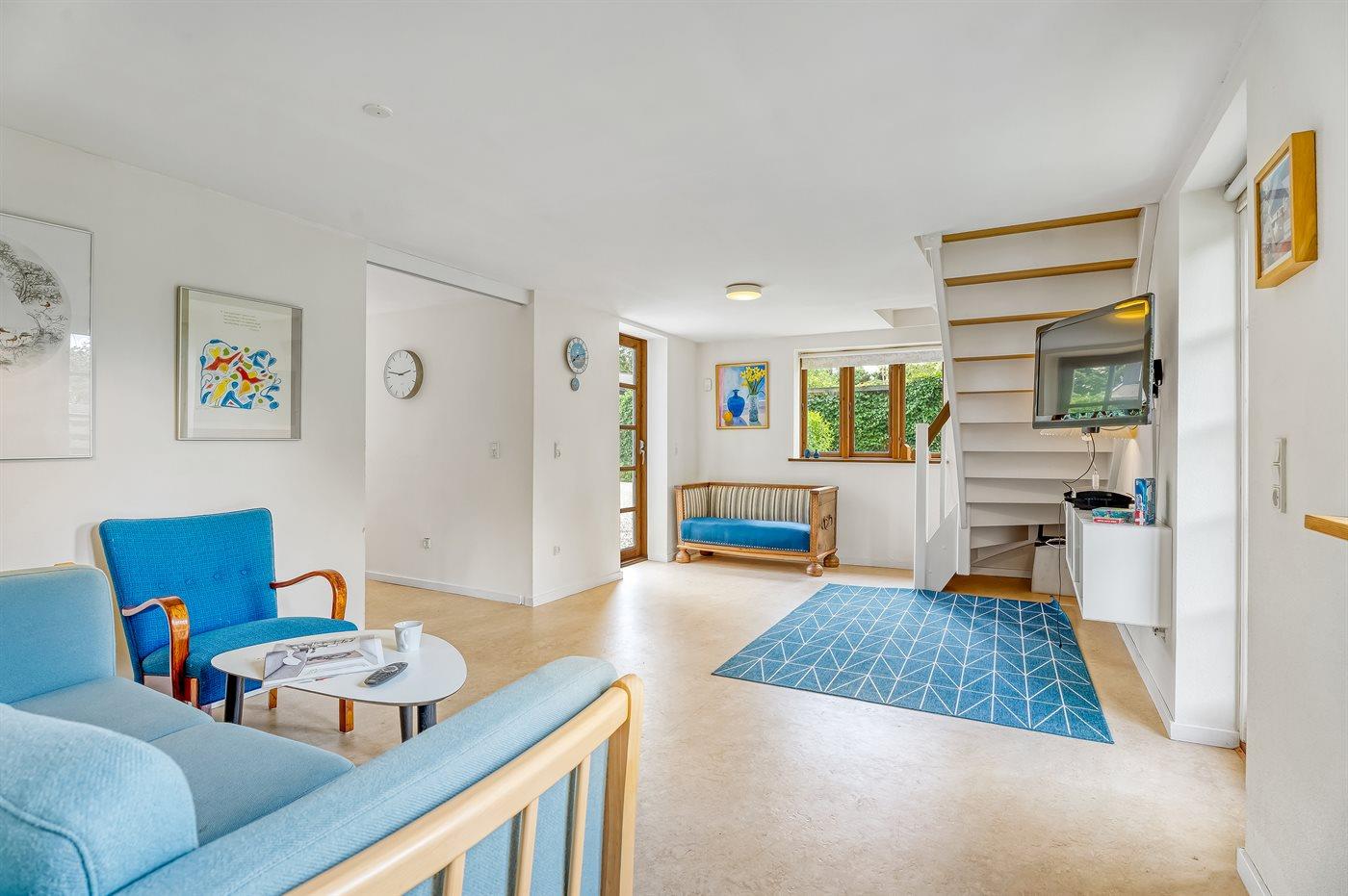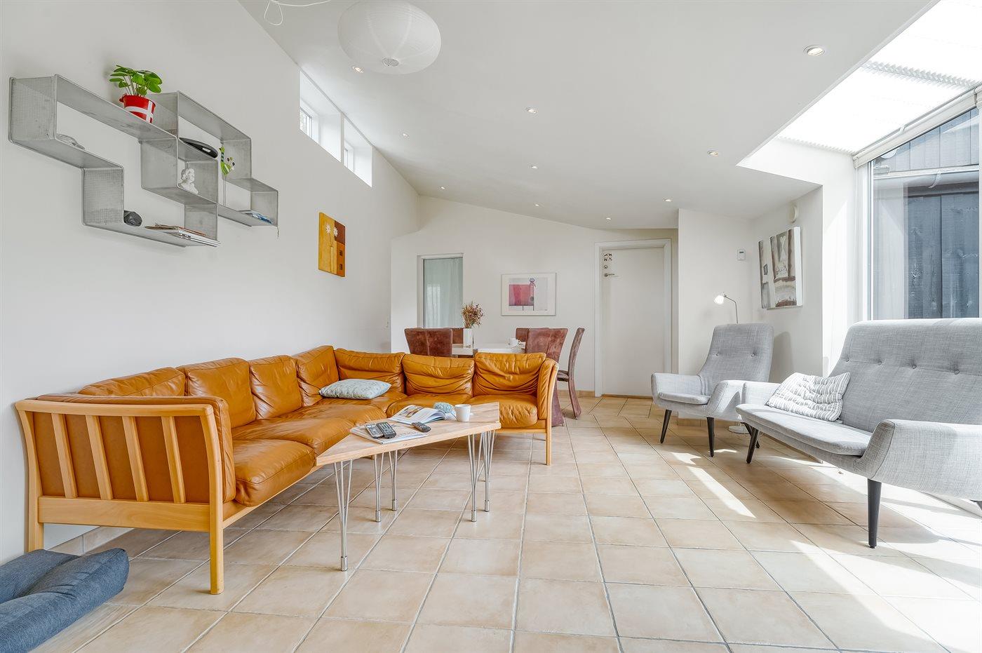 Alt fremtræder indbydende og hyggeligt med opvarmede klinker via oliefyr, delvist lofter til kip og nogle dejlige lysindfald ind til huset.