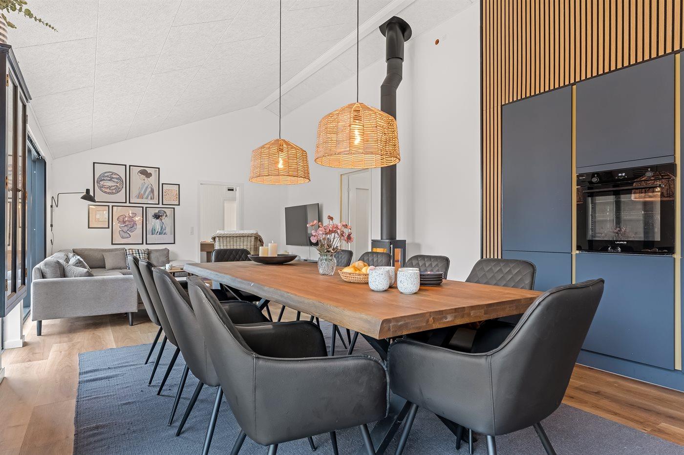 Sommerhuset egner sig til 10 personer. 2 af sovepladserne er kun egnet til større børn (4-11 år). Ferieboligen er på 151 m² og er bygget i 2024. Det er tilladt at medbringe 2 husdyr. Ferieboligen er udstyret med 2 energivenlige luft til luft varmepumper. Ferieboligen har vaskemaskine. Tørretumbler. Frysekapacitet på 114 liter. Der er desuden brændeovn. Til de små er der 1 stk. barnestol. Puslebord. Puslepude.
