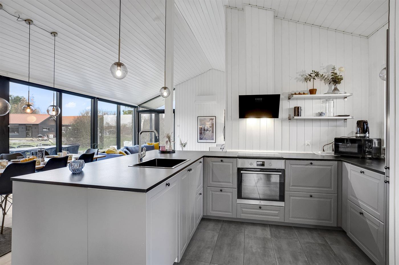 Køkkenet er udstyret med 1 køleskab. Der er 4 induktionskogeplader, varmluftovn, mikrobølgeovn samt opvaskemaskine.