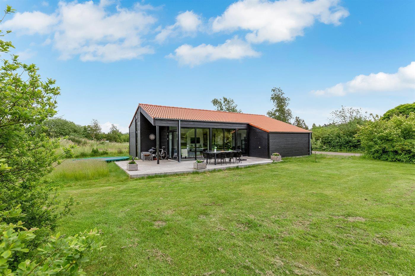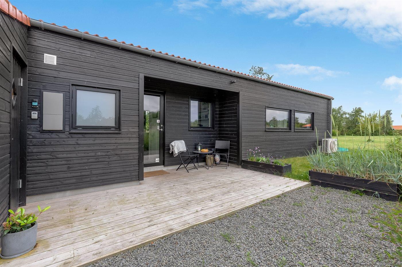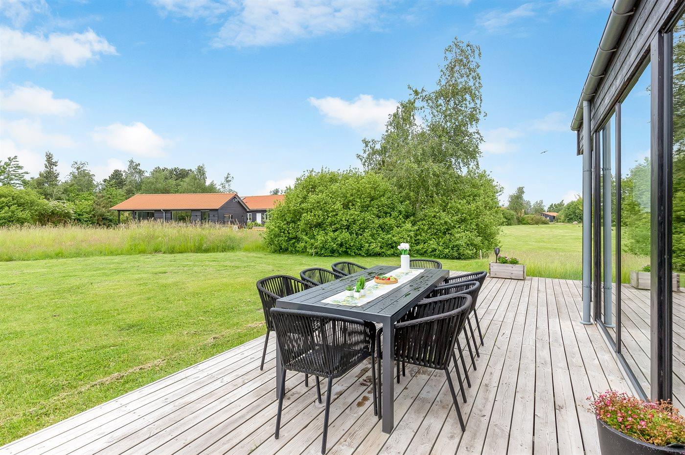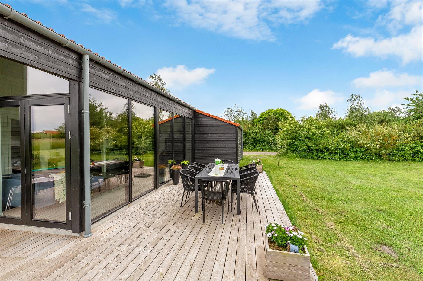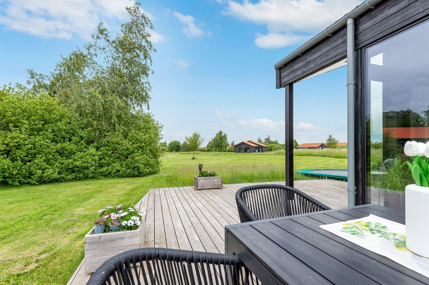 Huset ligger på en stor naturgrund med en terrasse, hvor der er god plads til at solbade, slappe af, hygge med familien og grille på gode sommeraftener.