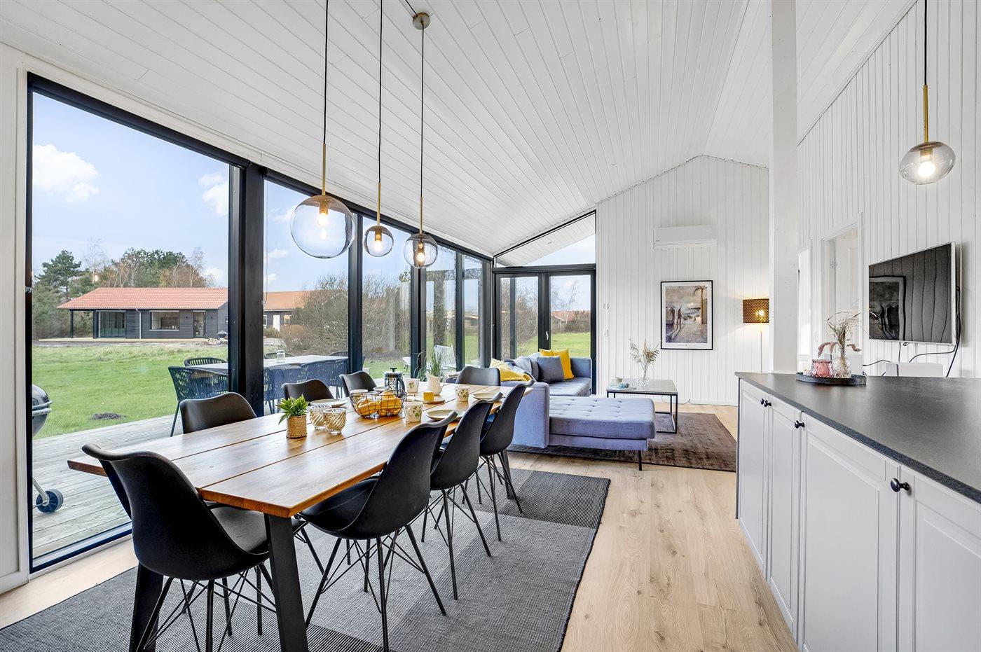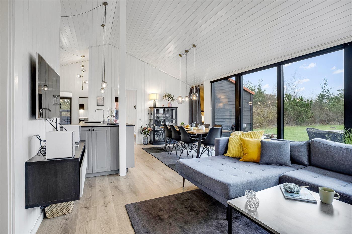 Køkkenet er lyst og i åben forbindelse med stuen, der er moderne indrettet. Der er tre soveværelser fordelt på to værelser med dobbeltsenge og et værelse med køjeseng til 2 personer. Desuden er der en stor, hyggelig alkove for enden af stuen med dobbeltmadras. Sommerhuset har en energibesparende luft/luft varmepumpe, der også kan bruges som klimaanlæg.