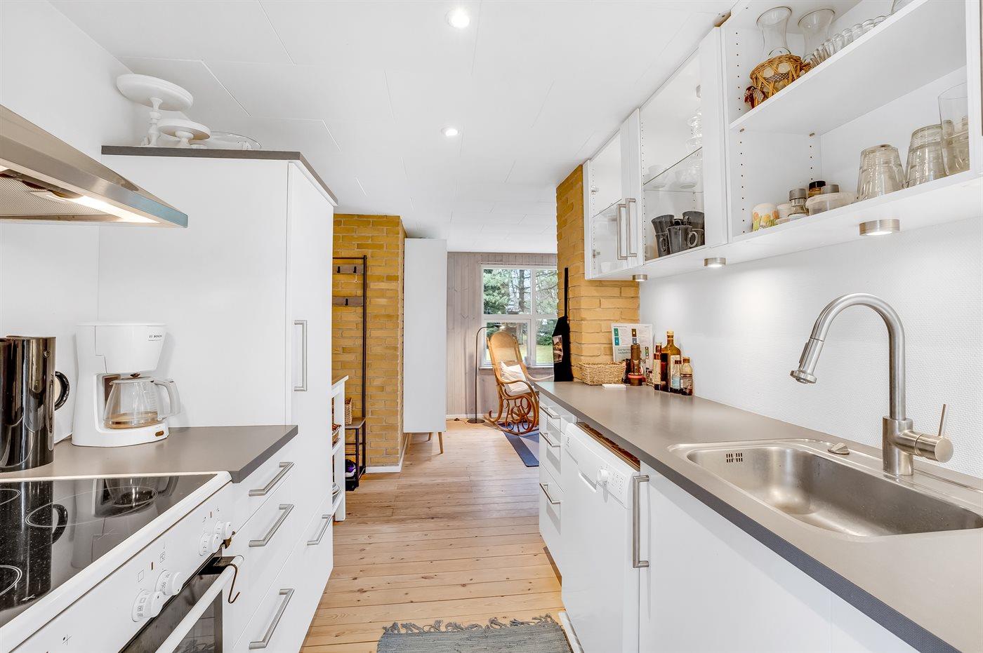 Køkkenet er udstyret med 1 køleskab. Der er 4 keramiske kogeplader, varmluftovn samt opvaskemaskine.