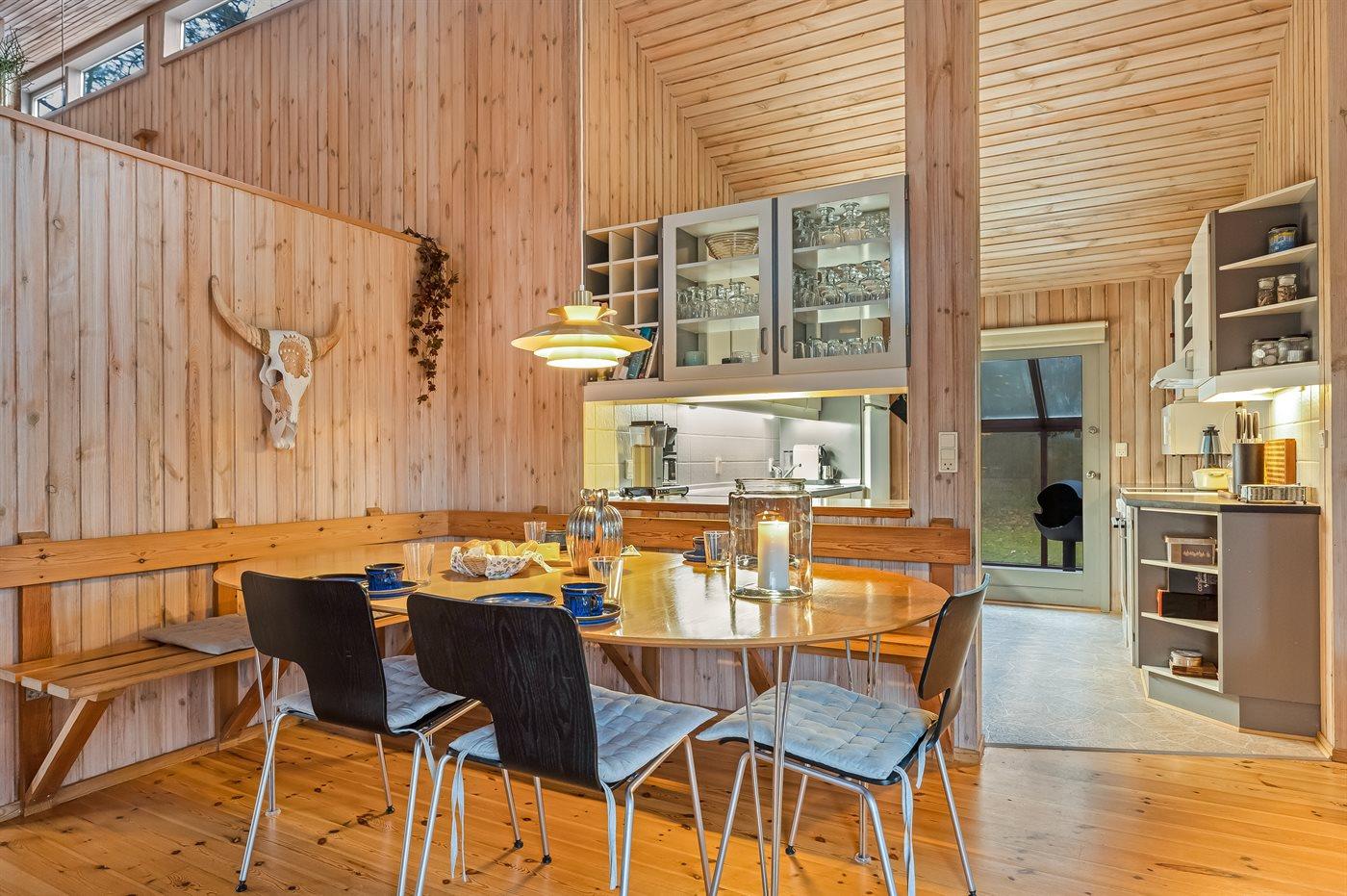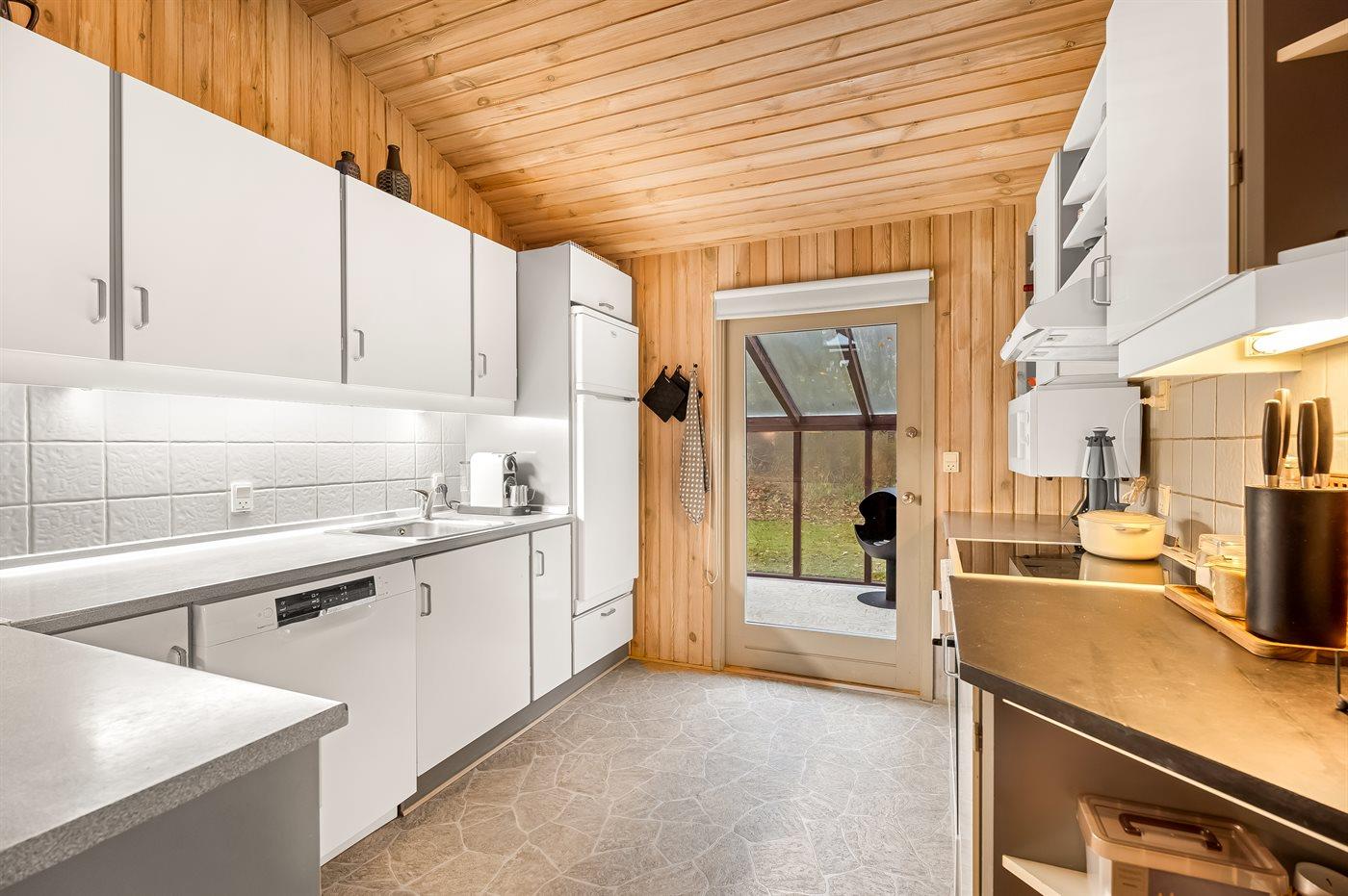 Køkkenet er udstyret med 1 køleskab. Der er 4 keramiske kogeplader, varmluftovn, mikrobølgeovn samt opvaskemaskine.