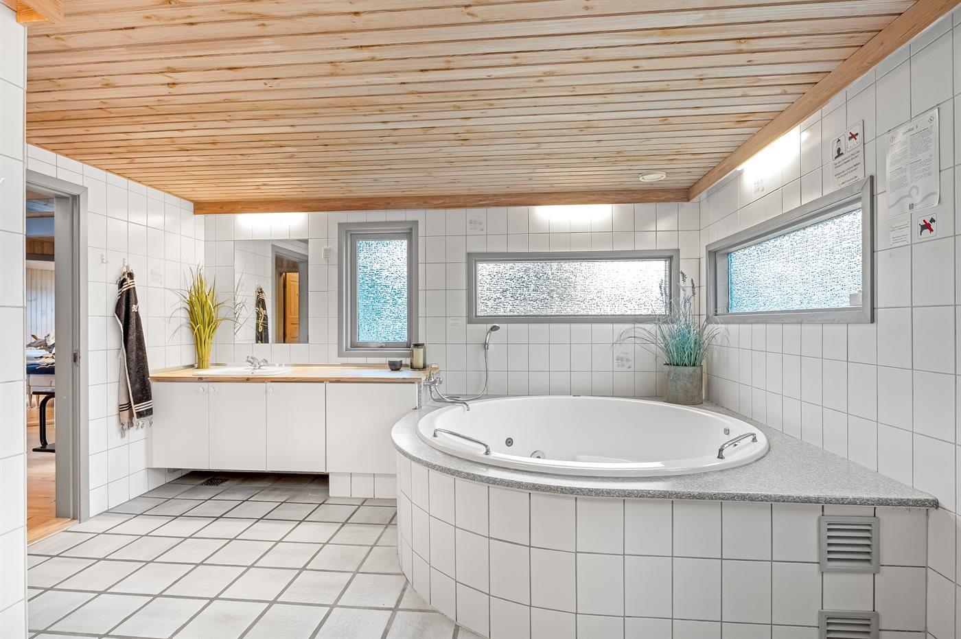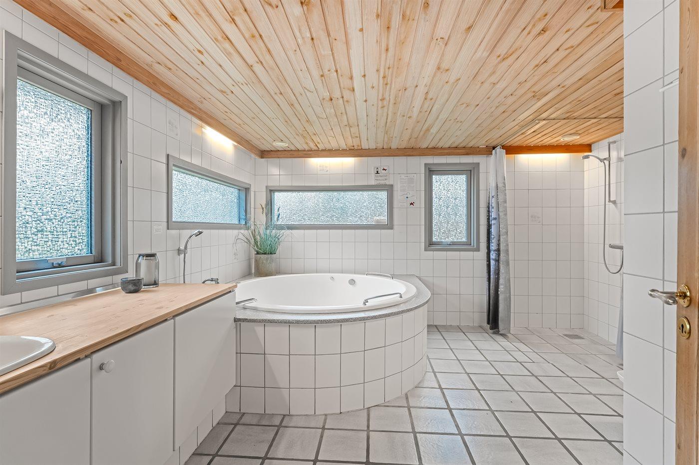 Der er 1 badeværelse med bruseniche og 2 toiletter, heraf 1 gæstetoilet. Der er gulvvarme på 1 badeværelse. I saunaen er der mulighed for afslapning.