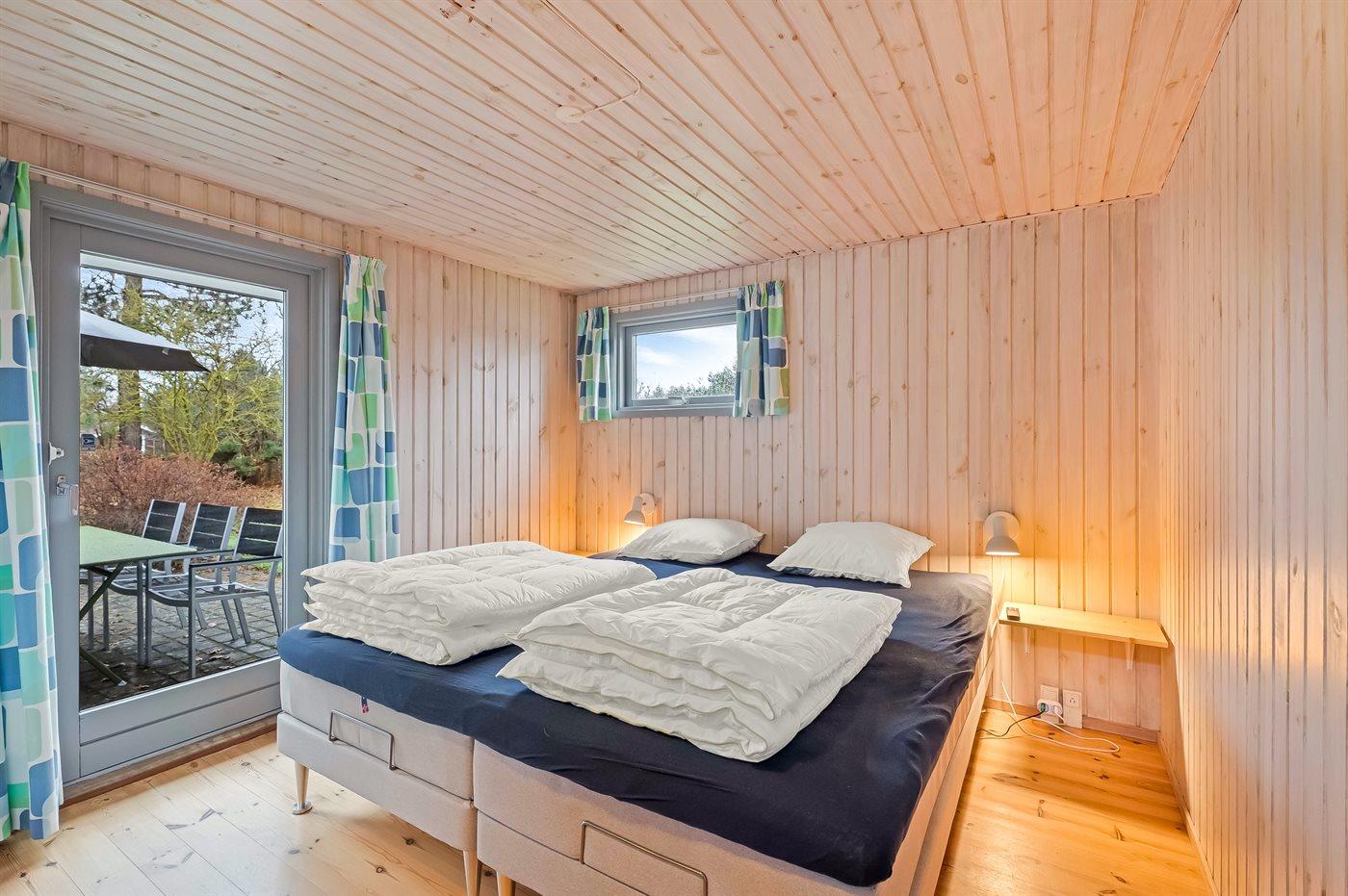 Der er i alt 3 soveværelser. Sovepladserne fordeler sig på: 6 sovepladser i dobbeltsenge.1 soveplads i køjeseng. 4 sovepladser på madrasser. 4 af disse sovepladser befinder sig på husets hems. Derudover er der 1 stk. barneseng.