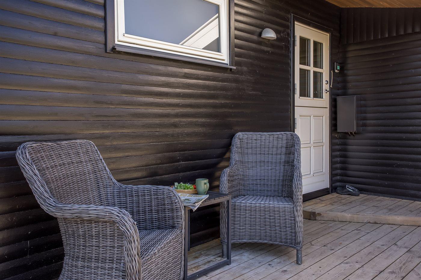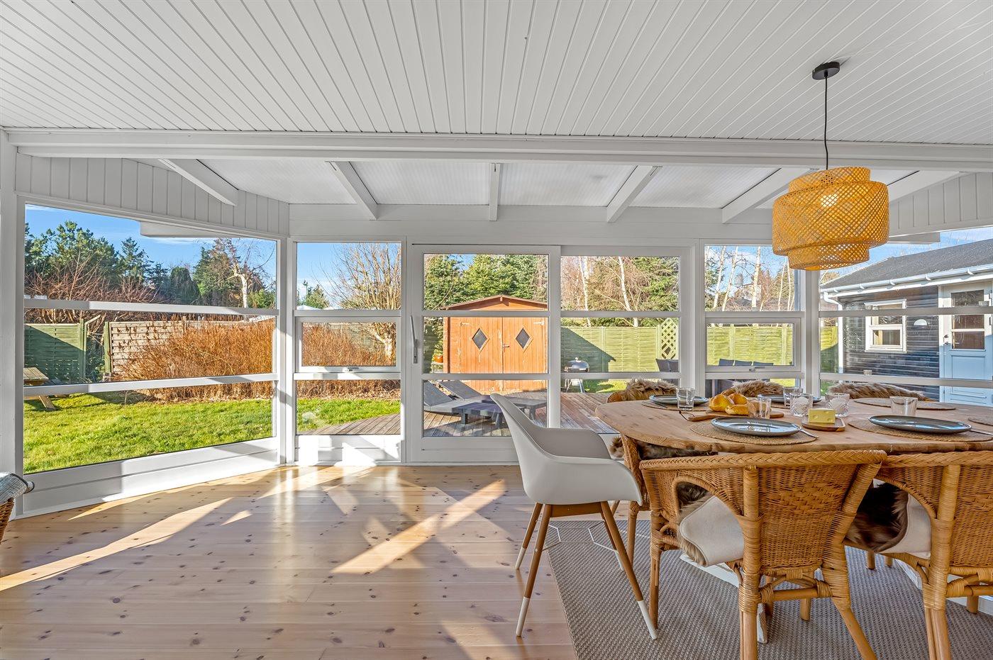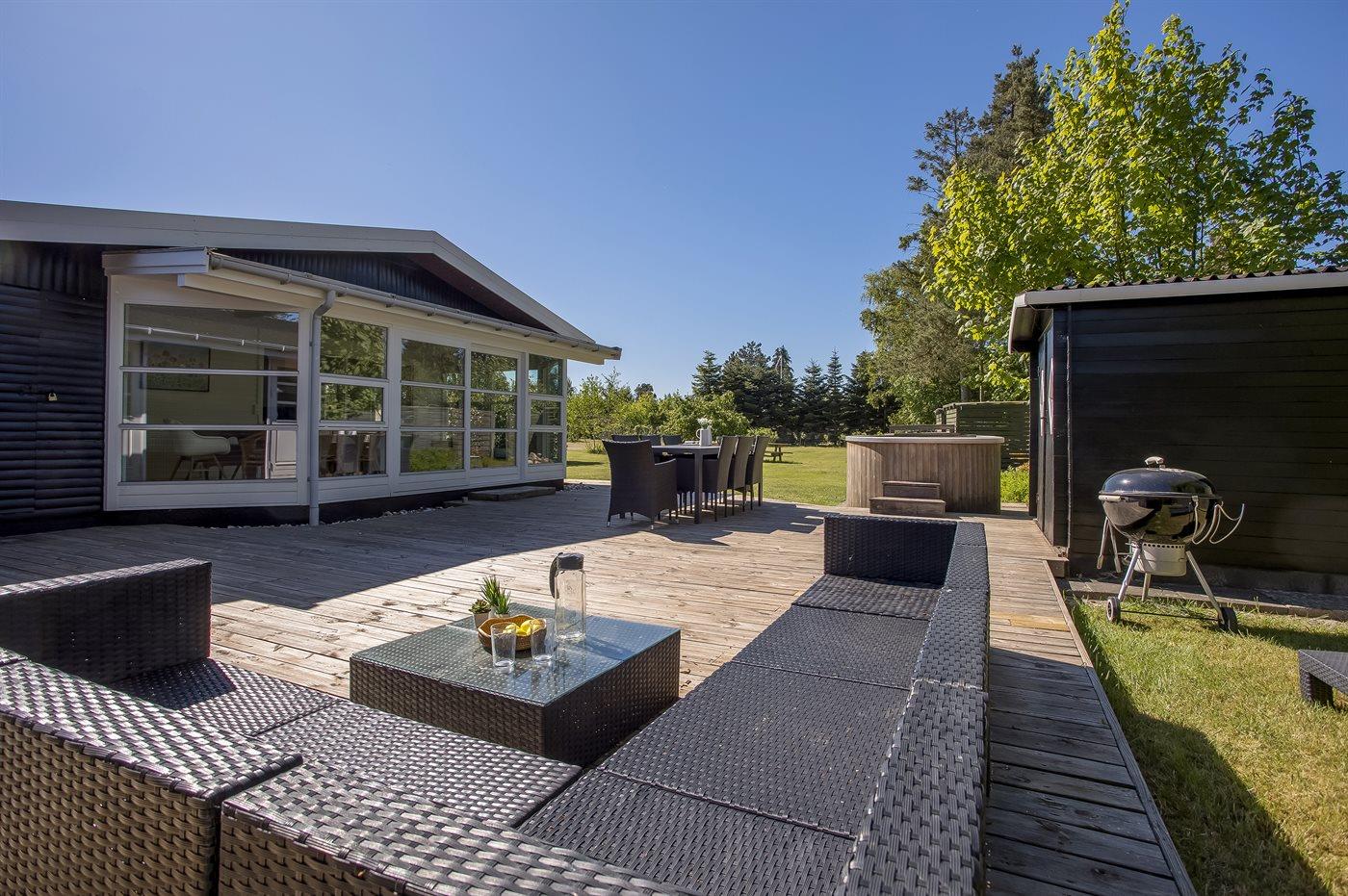 Der findes en skøn terrasse med bl.a. et dejligt vildmarkskar til 6 personer, god plads til dejlige timer i det fri samt en grill, hvor du kan tilberede lidt lækkert en varm sommerdag. Desuden er der fra stuen adgang til en stor udestue.