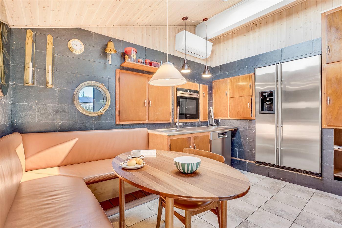 Køkkenet er udstyret med 1 køleskab. Der er 5 gasblus, varmluftovn, mikrobølgeovn samt opvaskemaskine.