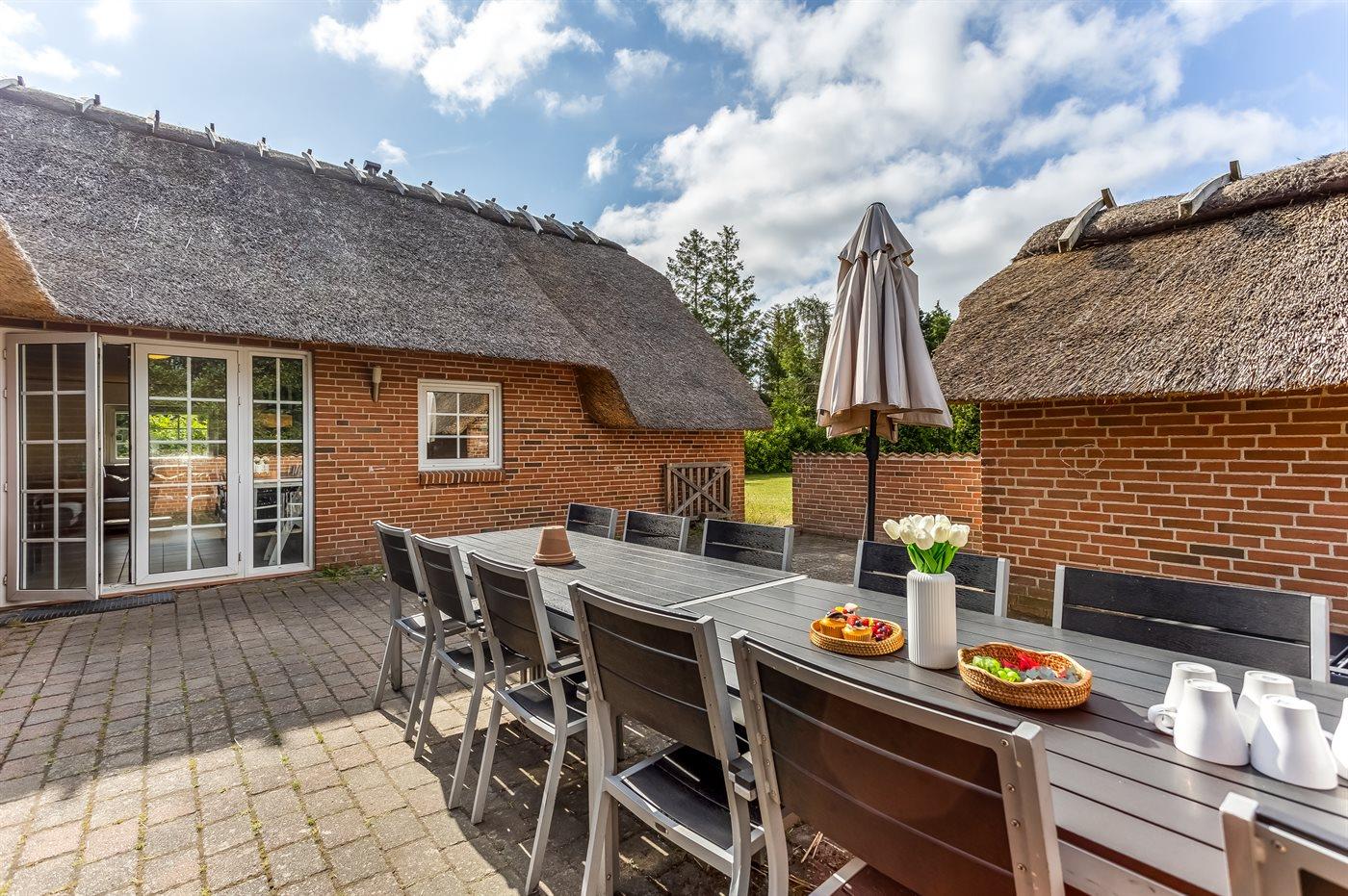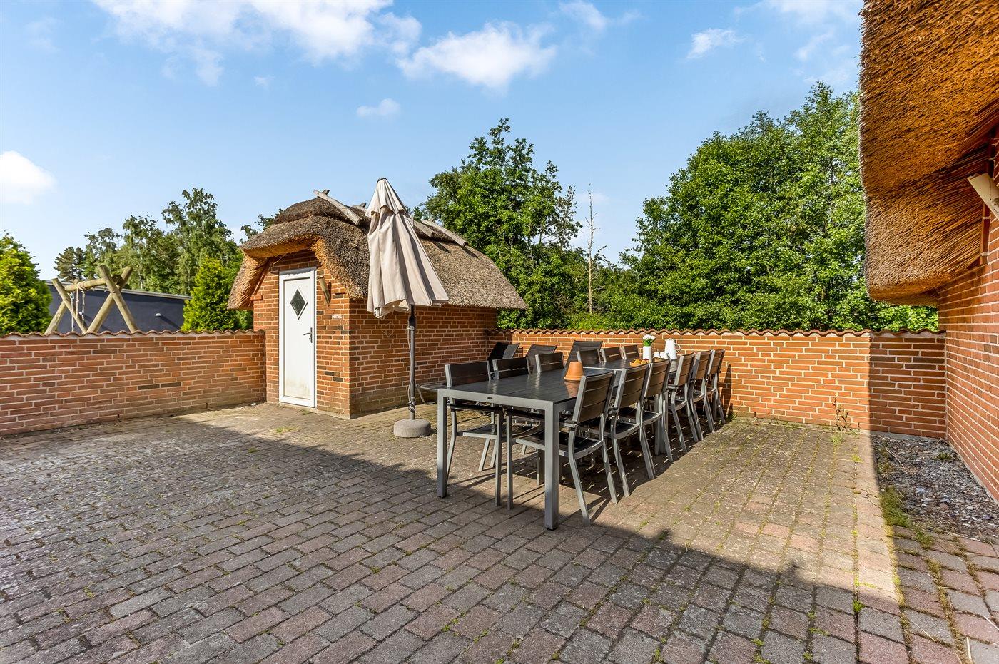 Til huset hører en stor terrasse med god plads til timer i det fri – her kan du slappe af med en god bog eller nyde et lækkert måltid tilberedt på grillen.