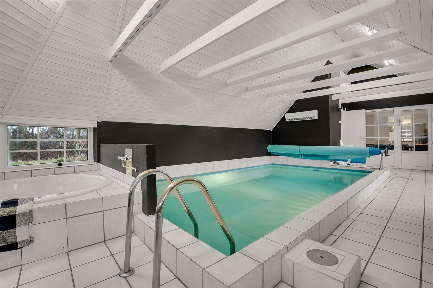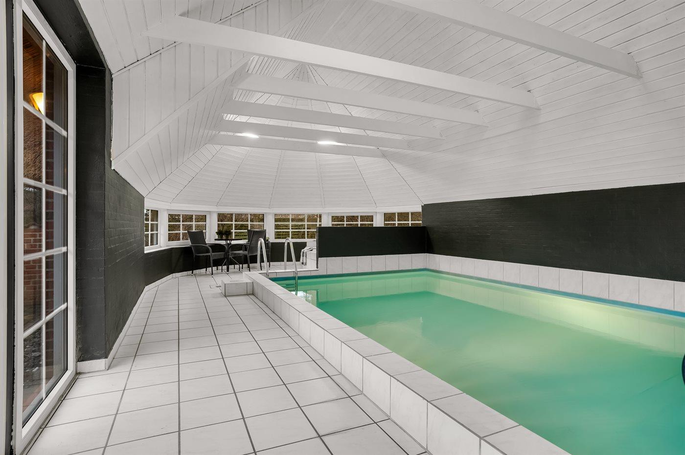 I den indendørs swimmingpool er der mulighed for leg og hyggeligt samvær. Swimmingpoolen måler op til 3,45 m i bredden, 6 m i længden og den er op til 1,35 m dyb. Vandet er mellem 24 og 28° C varmt. Der er gulvvarme i swimmingpoolområdet.
