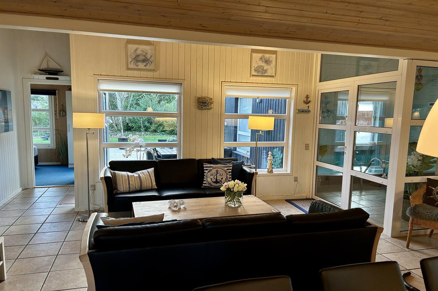 Der er indgang til en lille entré i hjørnet af køkken-alrummet, hvor man træder direkte ind i husets hjerte. Herfra er der frit kik til køkkenafdelingen, som indeholder alt hvad der behøves til en god ferie. Køkkenet ligger i åben forbindelse med stuen, der indeholder en sofagruppe samt TV, og store vinduer ud mod haven. Et stort spisebord adskiller køkkenet fra stuen.