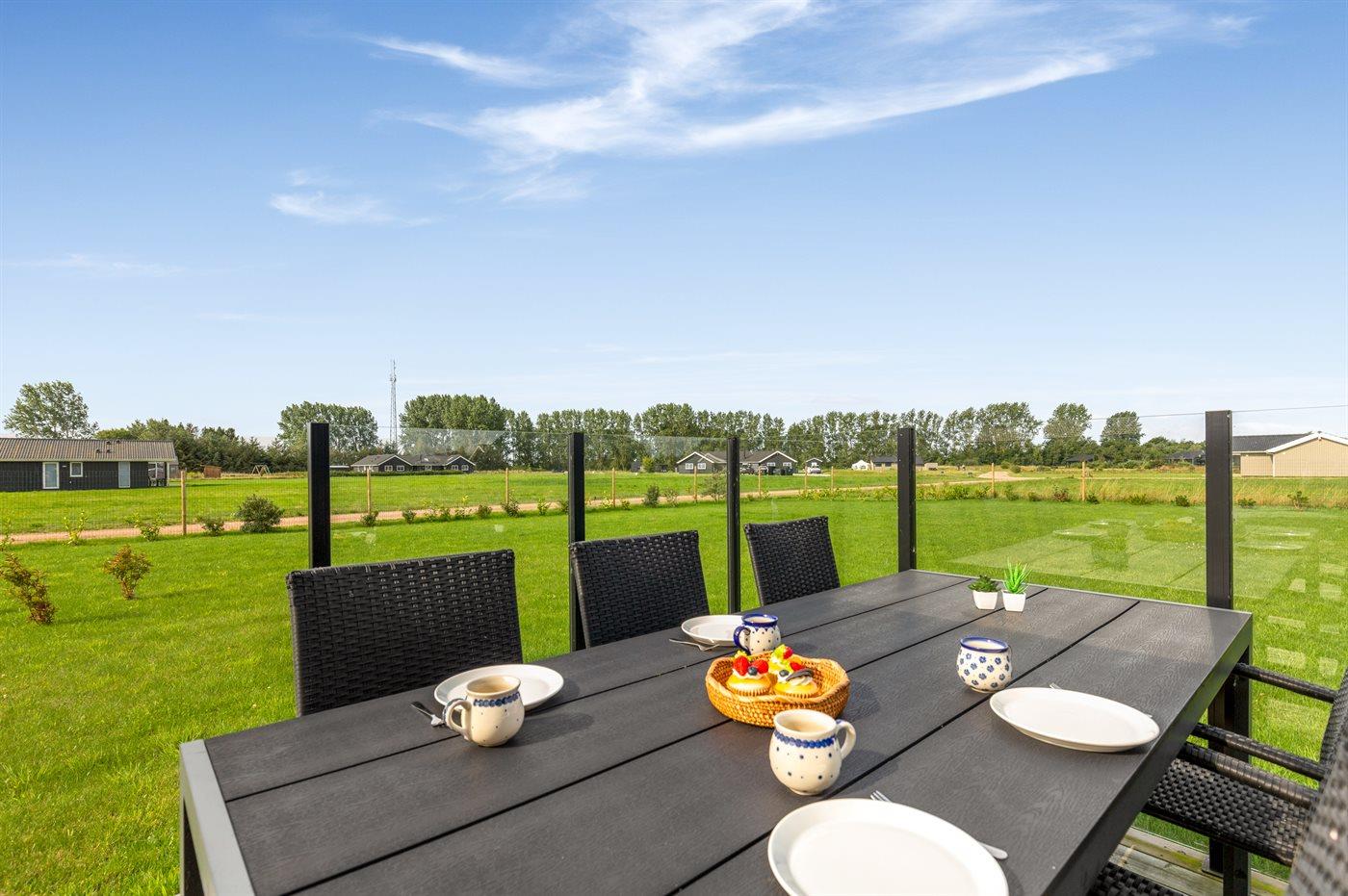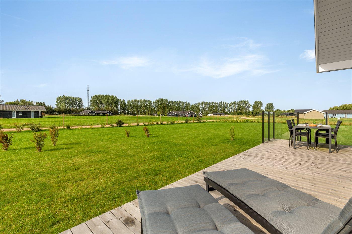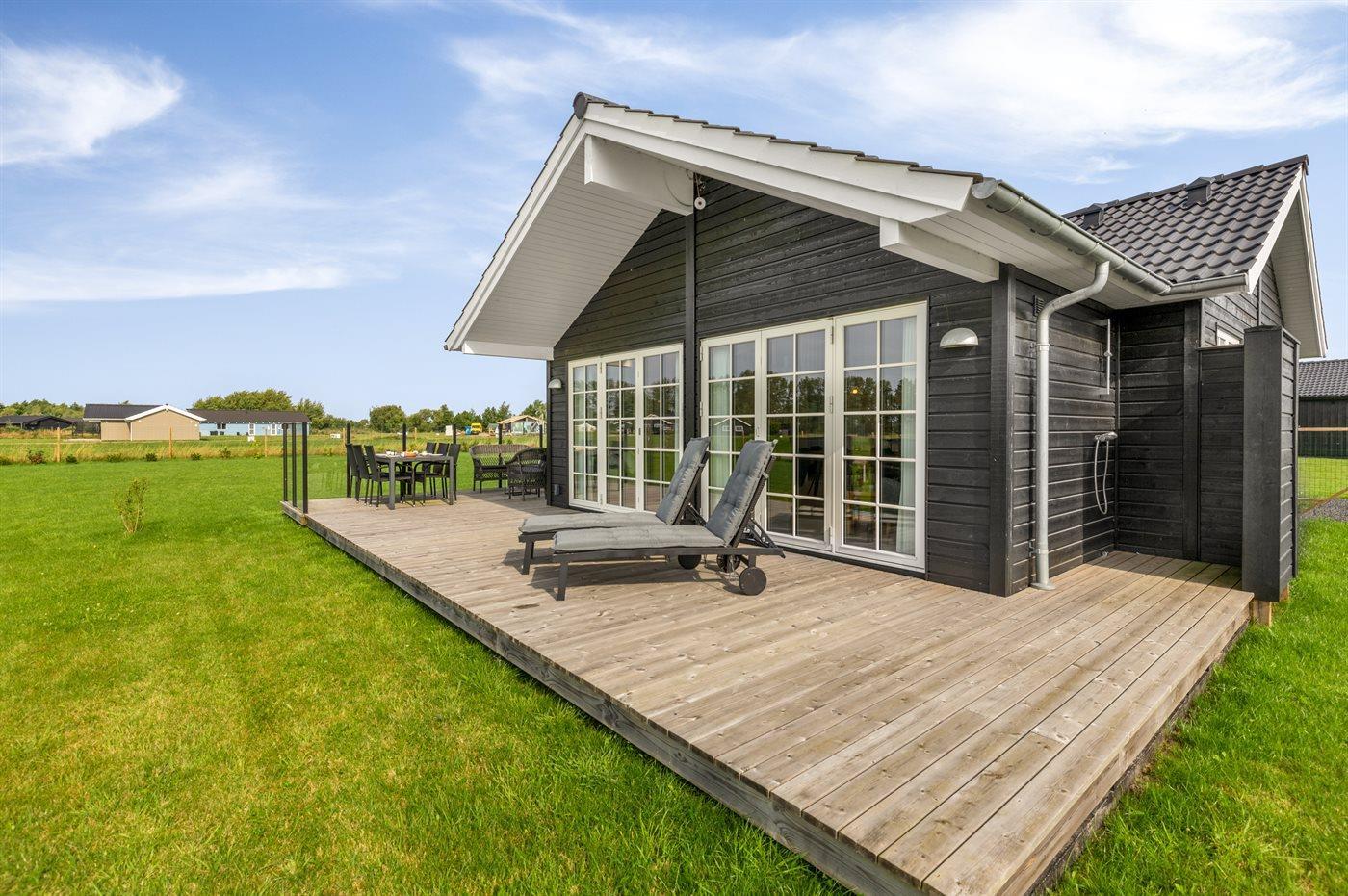 Huset er indrettet med et stort køkken alrum og er i åben forbindelse med stuen, hvorfra der er udgang til den hyggelige træterrasse. På terrassen er der liggevogne, havemøbler og grill til rådighed.