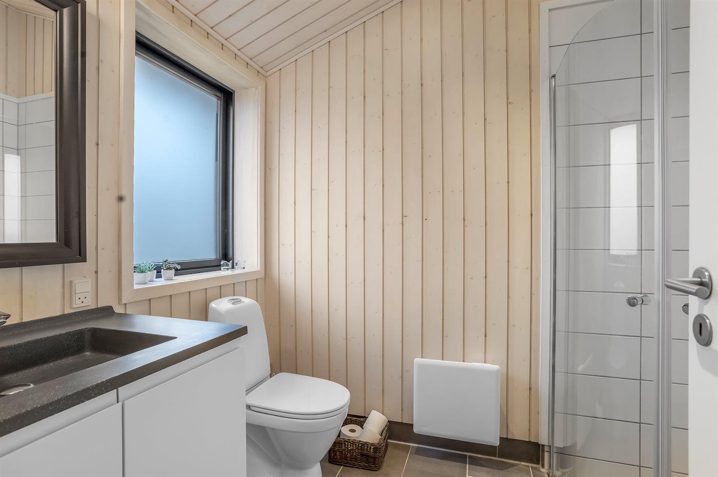 Der er 2 badeværelser med bruseniche og 2 toiletter. Der er gulvvarme på 2 badeværelser.. Badekar. I saunaen er der mulighed for afslapning.