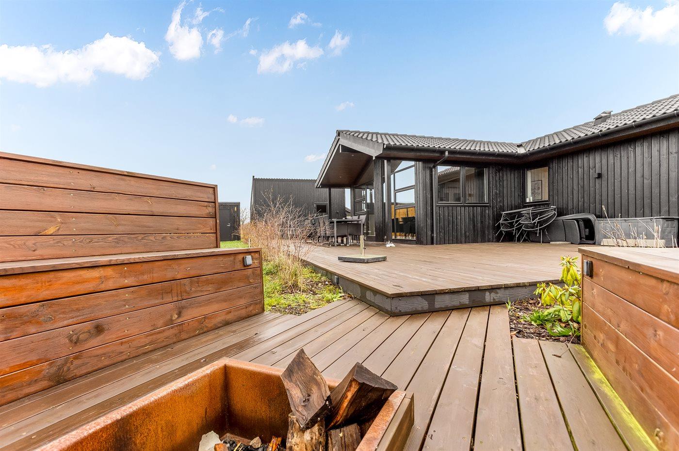 Ferieboligen er beliggende på en 1200 m² stor havegrund. Grunden er indhegnet. Der er 900 m til havet. Nærmeste forretning er beliggende i en afstand af 800 m. Der er en golfbane i en afstand af 1500 m. Til ferieboligen hører åbent terrasseareal. Desuden er der overdækket terrasse. Trampolin. Der ligger en legeplads i en afstand af 800 m. Bålsted. Udendørs bruser. Grill til rådighed. Parkering ved ferieboligen.