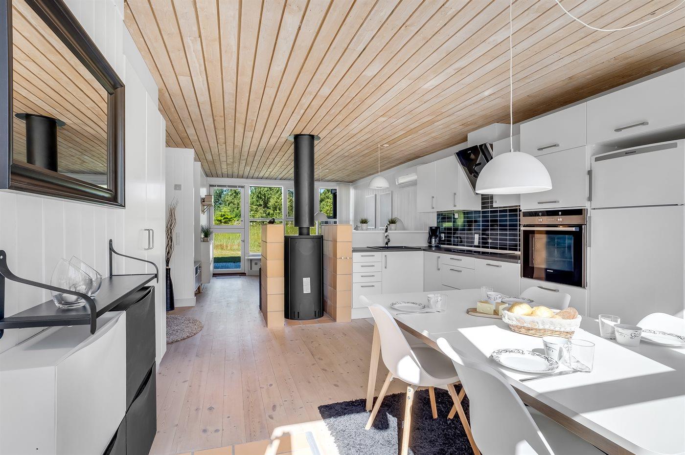 Køkkenet er udstyret med 1 køleskab. Der er 4 induktionskogeplader, varmluftovn, mikrobølgeovn samt opvaskemaskine.