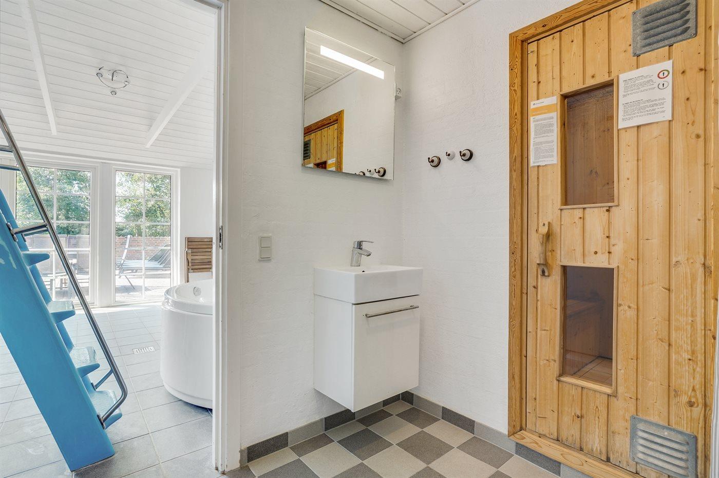 Der er 3 badeværelser med bruseniche og 3 toiletter. Der er gulvvarme på de 3 badeværelser. Der er mulighed for afslapning i indendørs spa til 2 personer eller i saunaen.