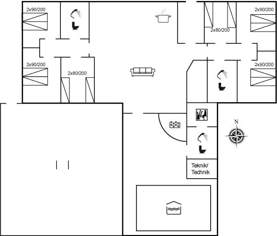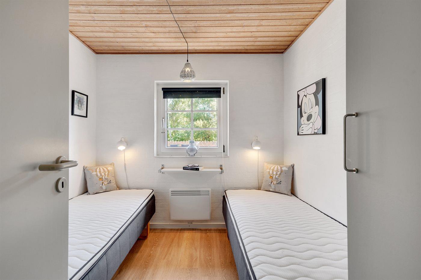 Der er i alt 6 soveværelser. Sovepladserne fordeler sig på: 8 sovepladser i dobbeltsenge. 4 sovepladser i enkeltsenge. Derudover er der 2 stk. barnesenge.