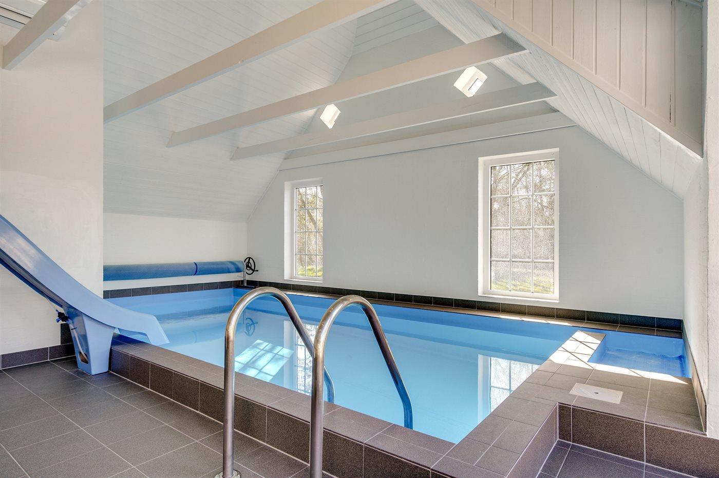 I den indendørs swimmingpool er der mulighed for leg og hyggeligt samvær. Swimmingpoolen måler op til 3,07 m i bredden, 5,75 m i længden og den er op til 1,3 m dyb. Vandet er mellem 24 og 28° C varmt. Gulvet i swimmingpoolområdet er opvarmet via varmepumperne.