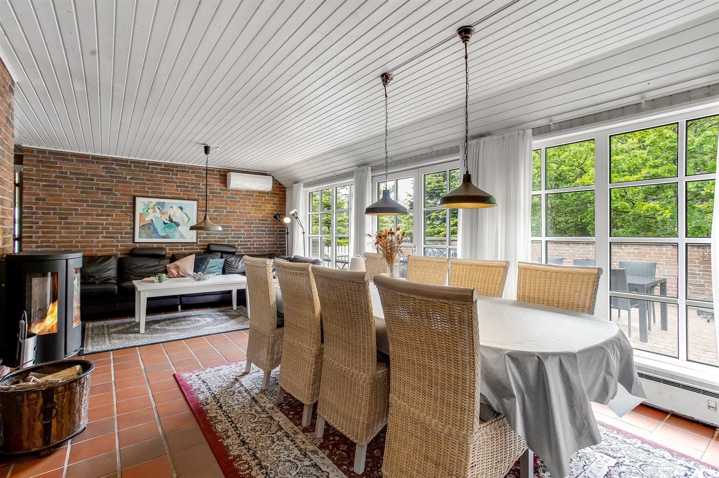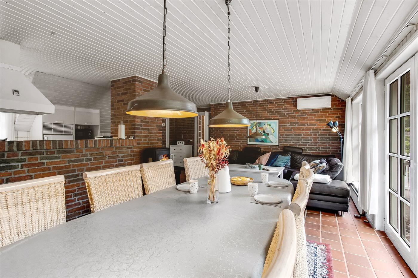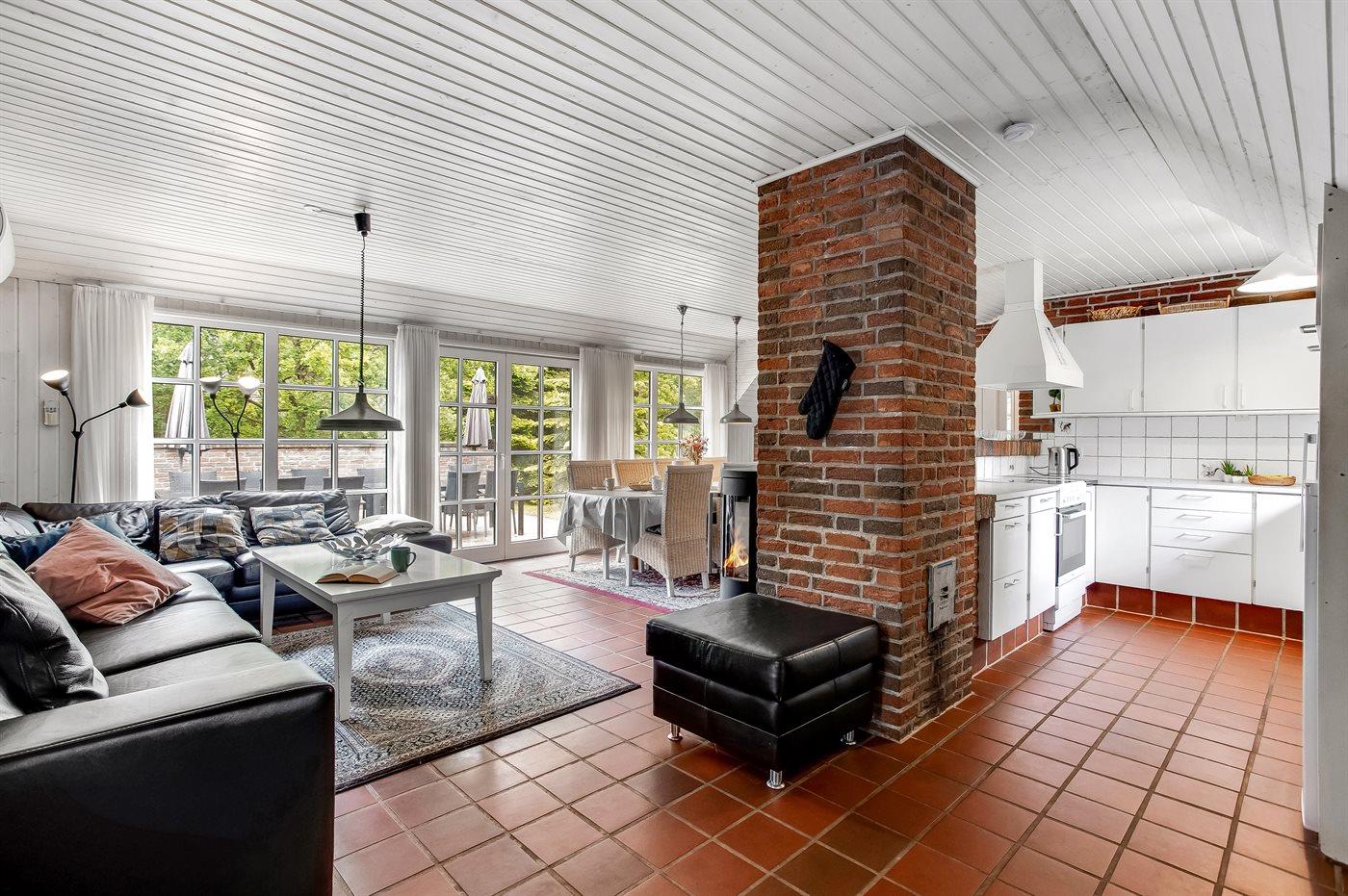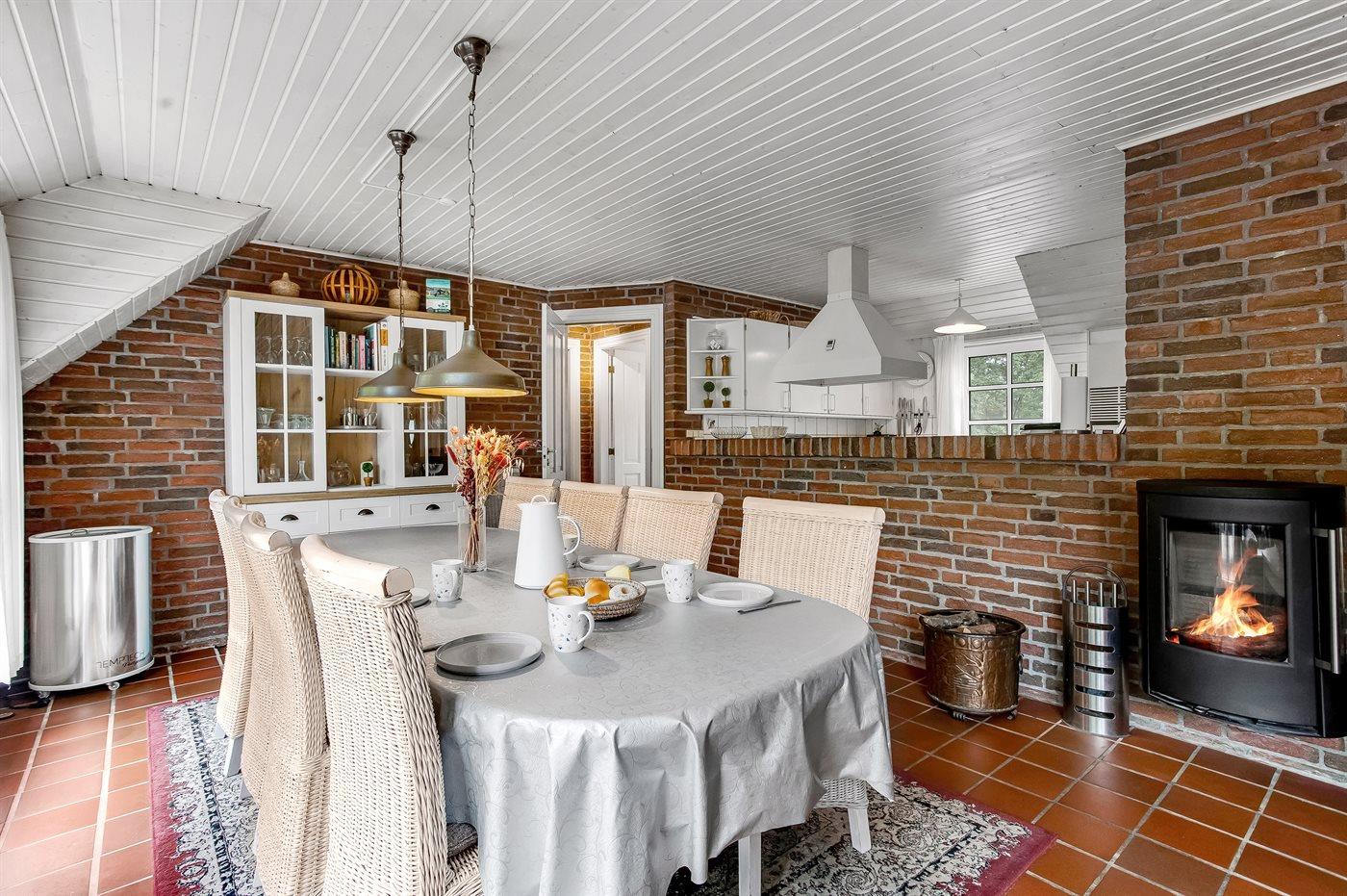 Midt i huset med adgang til den ene terrasse findes opholdsstuen med spisebord til 12 personer - til de små er der en barnestol. Her er også en stor sofagruppe samt tilhørende sofabord. I opholdsstuen er der plads til hygge ved brændeovnen med brætspil og kort Der er gulvvarme i hele opholdsrummet.