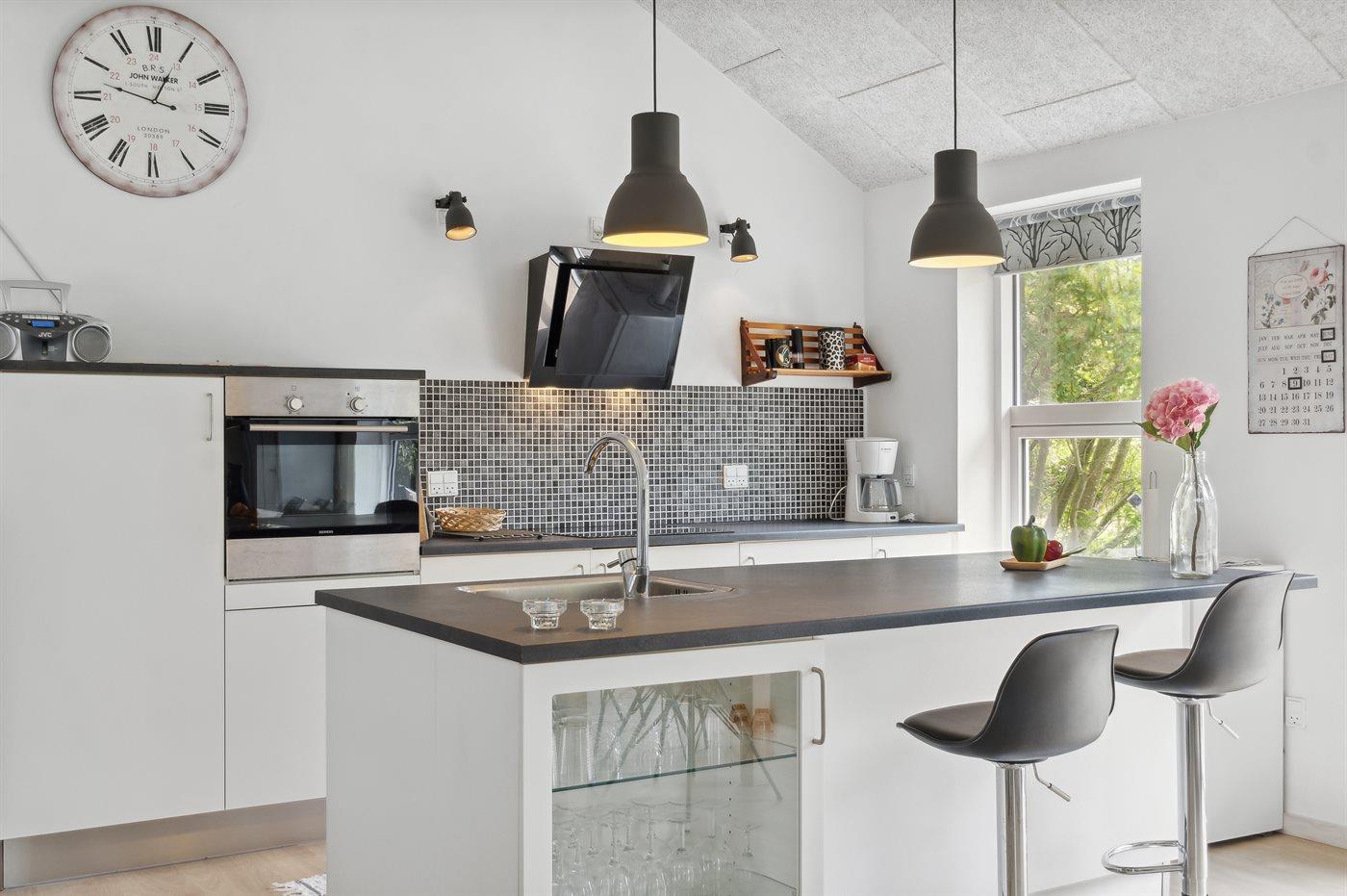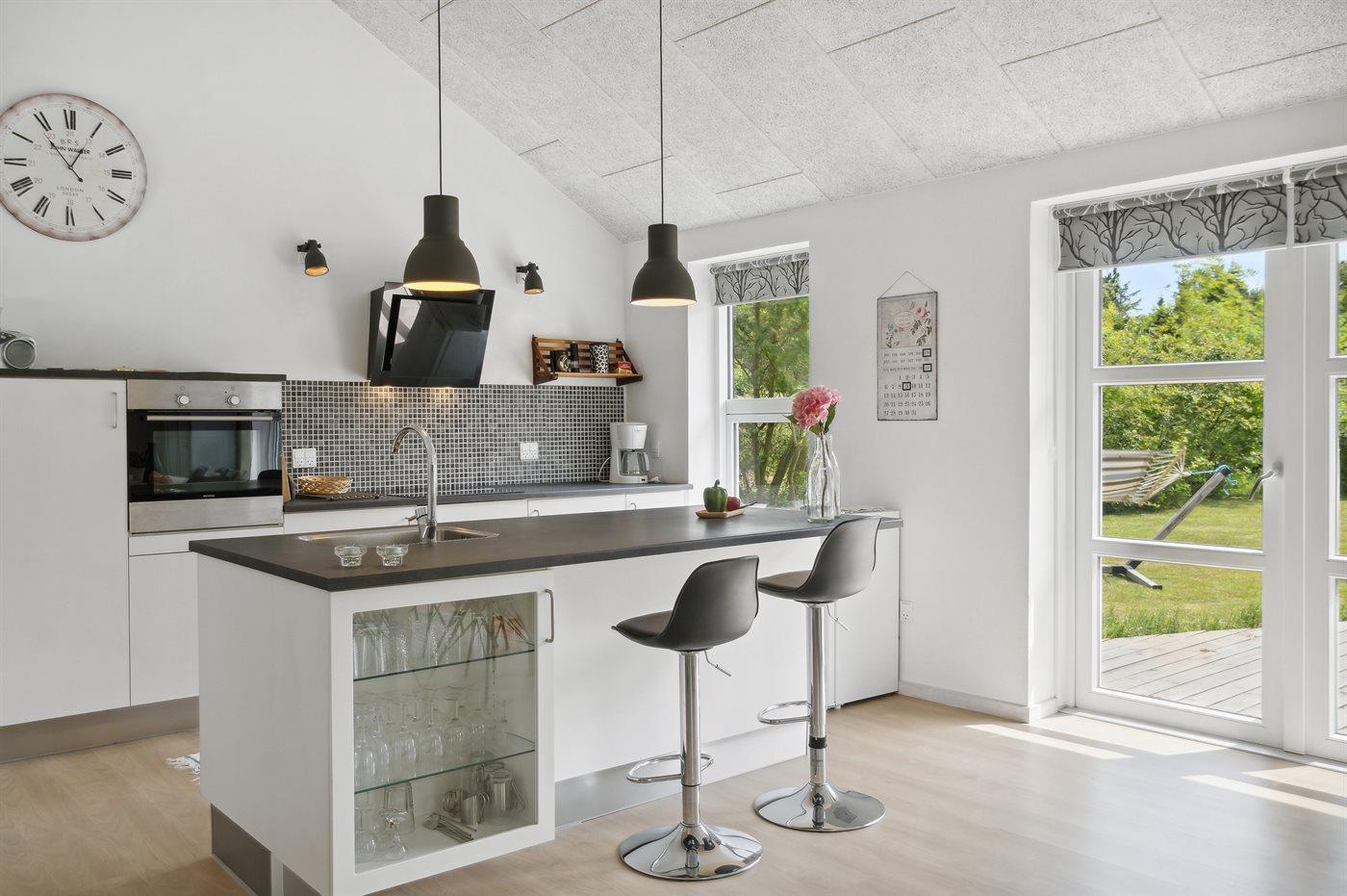 Køkkenet er udstyret med 1 køleskab. Der er 4 keramiske kogeplader, varmluftovn samt opvaskemaskine.