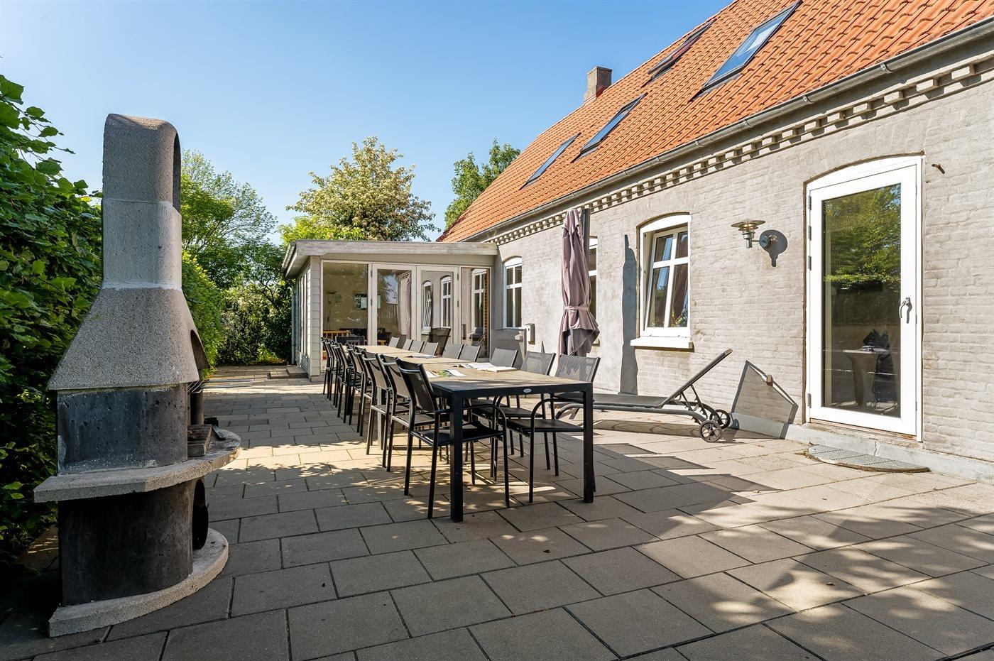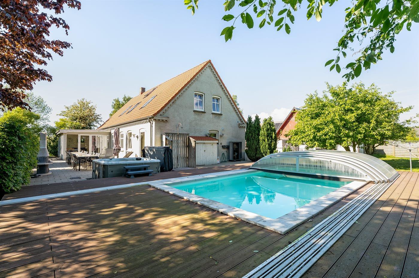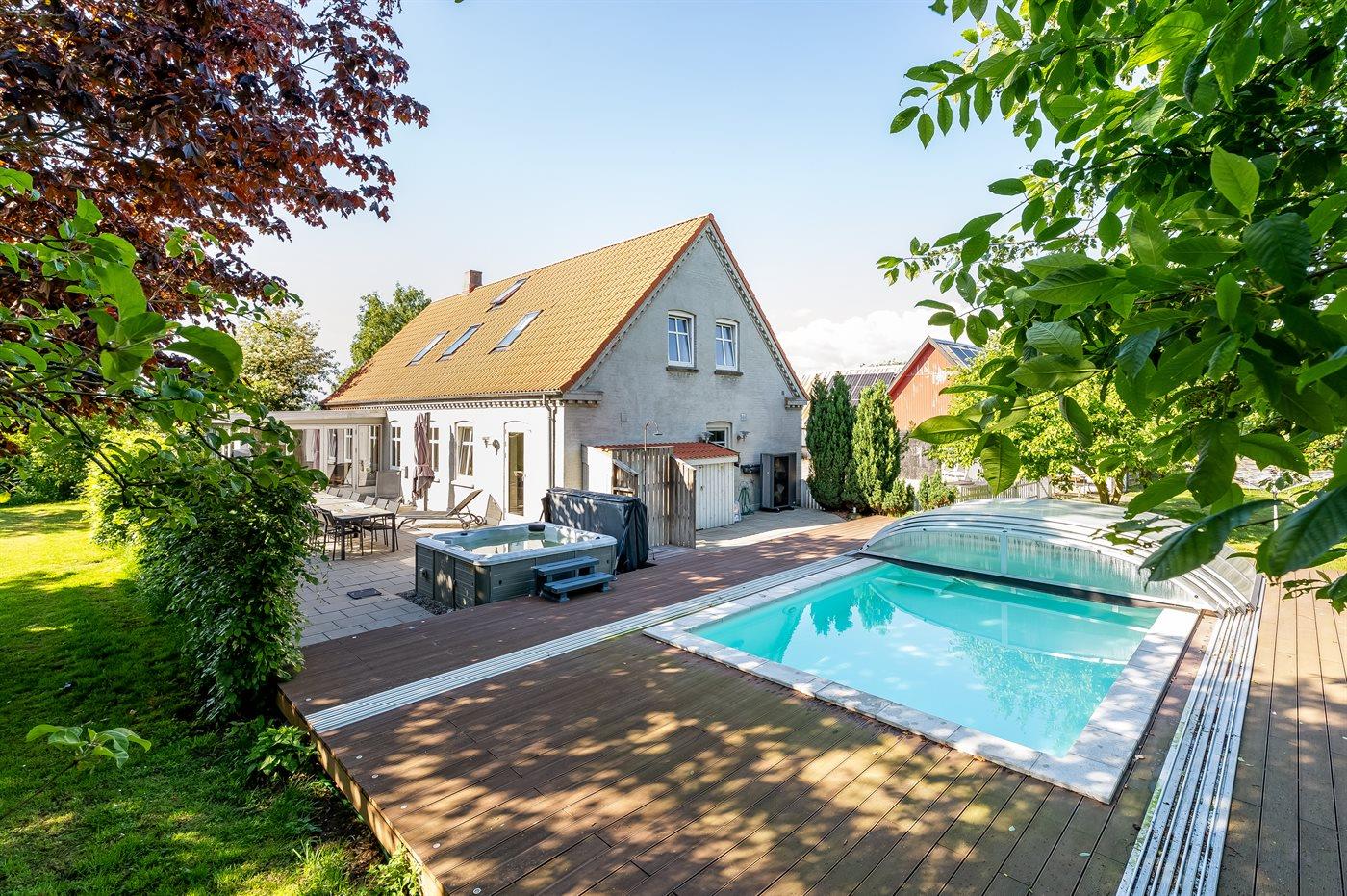 I landlige omgivelser ligger denne store feriebolig velegnet for flere familier, som ønsker at holde ferie sammen. Her er gode aktivitetsmuligheder ude som inde, og med soverum der hovedsageligt ligger på 1. sal inklusive hems, hvor 6 sovepladser befinder sig. Aktivitetsrum findes i åben forbindelse med opholdsstuen. Den udendørs swimmingpool står til rådighed fra 1. juni til 31. august.