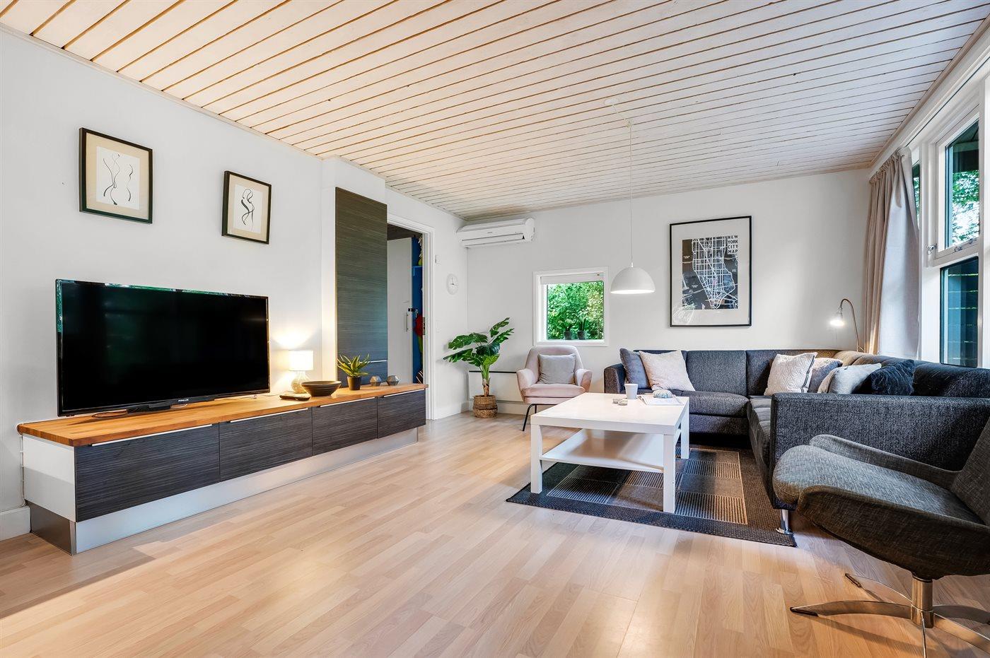 Huset er helårsisoleret og totalrenoveret i 2012/2018 og fremtræder lyst og meget imødekommende. Stuen er stor og åben med flere glaspartier med front mod vandet. Der er 2 store soveværelser, som begge har eget badeværelse og entre/skabe. Der er Waoo TV-pakke fra fibia med blandt andet DR, TV2, TV3 og Kanal 5 samt mange udenlandske kanaler, ligesom der findes trådløst bredbånd fra Fibia.