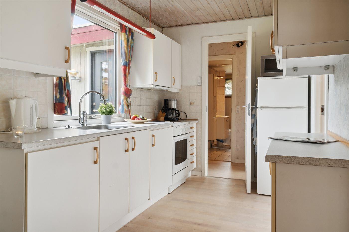 Køkkenet er udstyret med 1 køleskab. Der er 4 elkogeplader, bageovn, mikrobølgeovn.