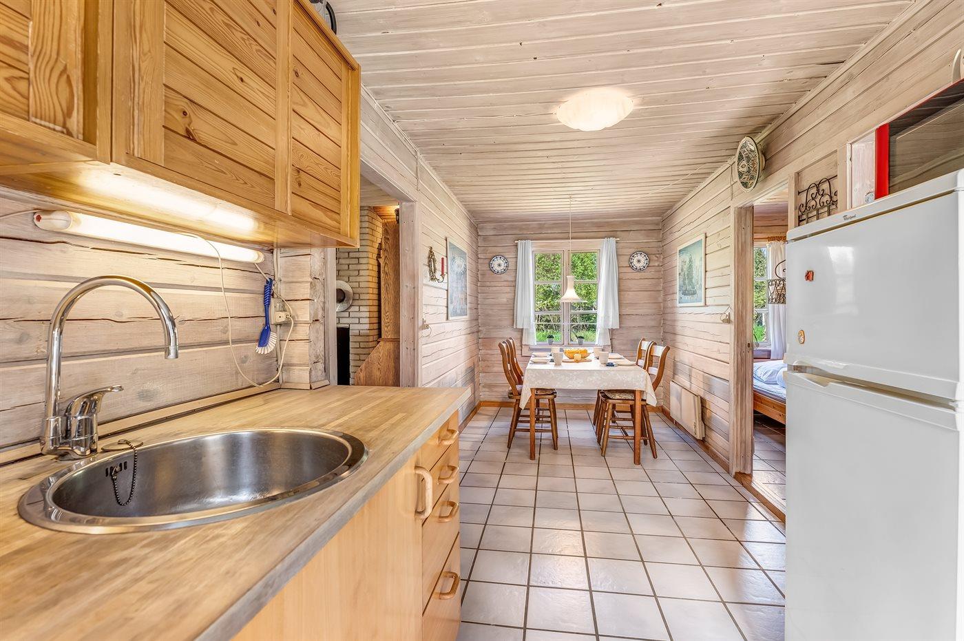 Køkkenet er udstyret med 1 køleskab. Der er 4 keramiske kogeplader, varmluftovn, mikrobølgeovn samt opvaskemaskine Der er gulvvarme i køkkenet.