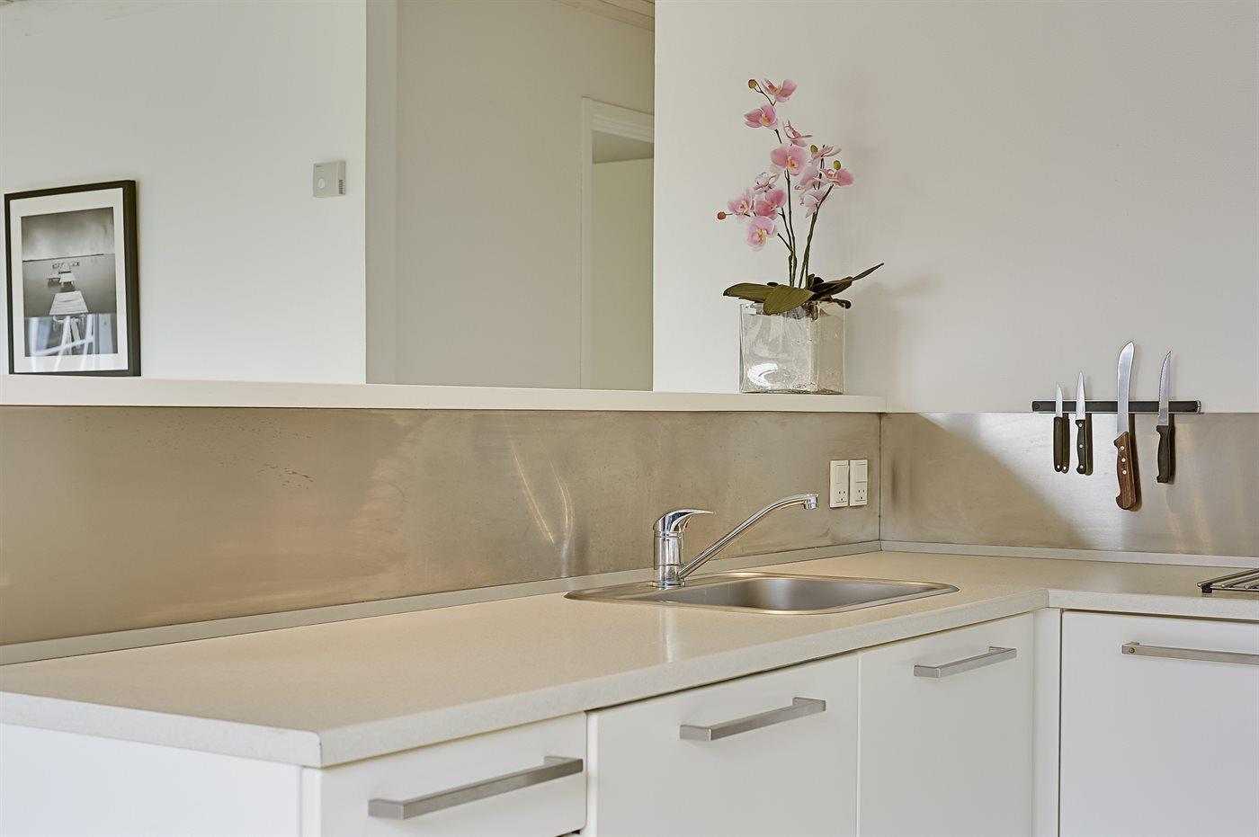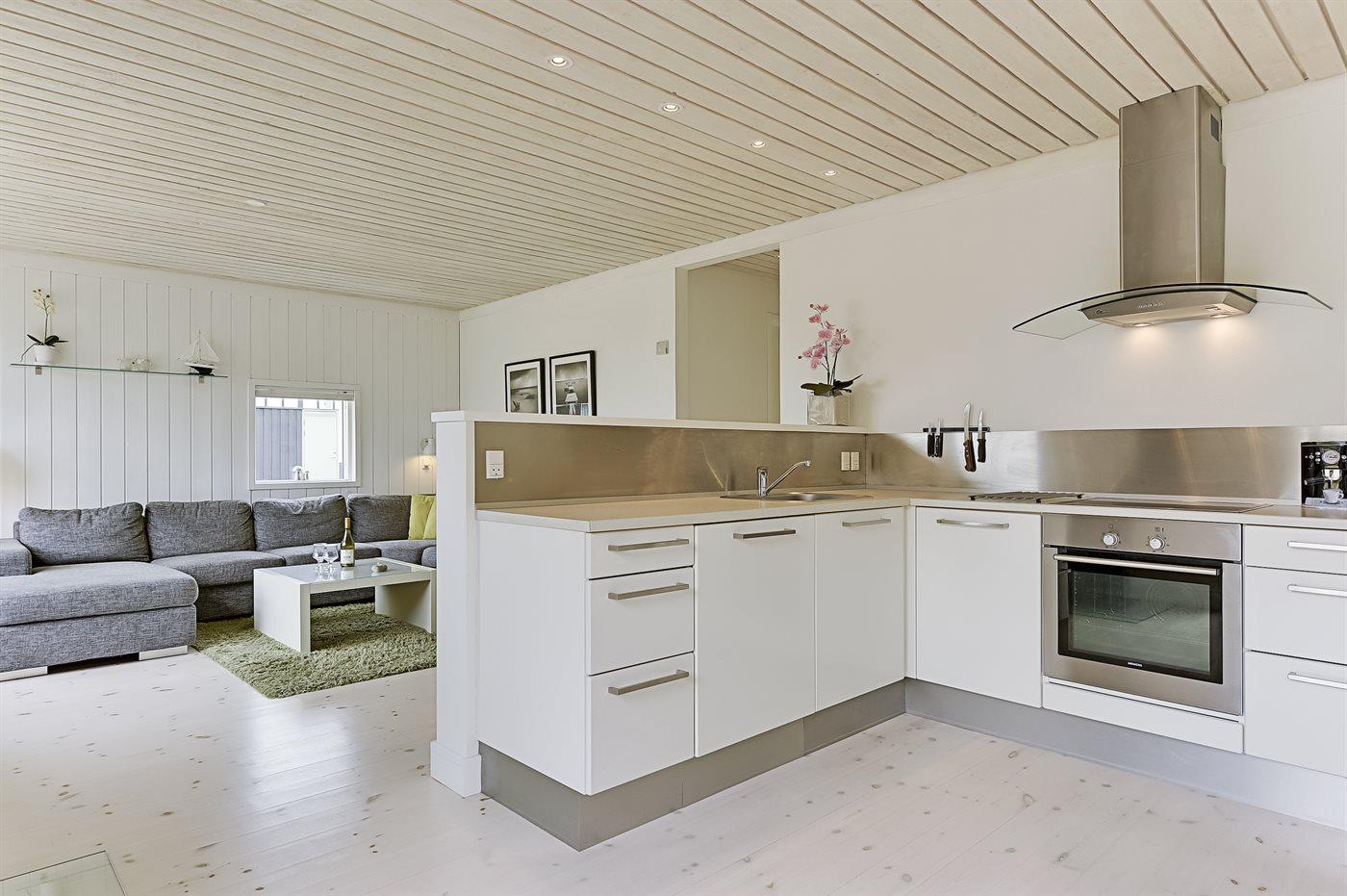 Køkkenet er udstyret med 1 køleskab. Der er 4 keramiske kogeplader, varmluftovn, mikrobølgeovn samt opvaskemaskine.