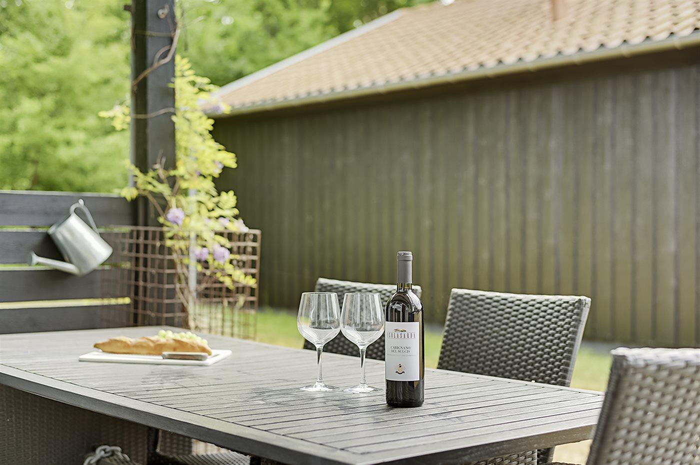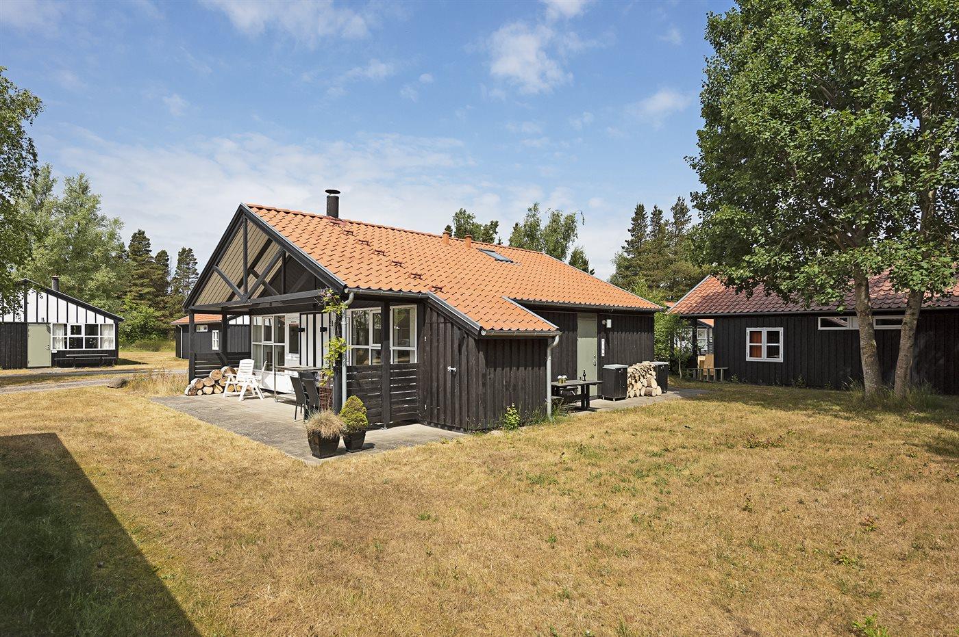 Lyst sommerhus i feriepark nær havet med terrasse, brændeovn og fælles faciliteter som grill og tennisbaner.