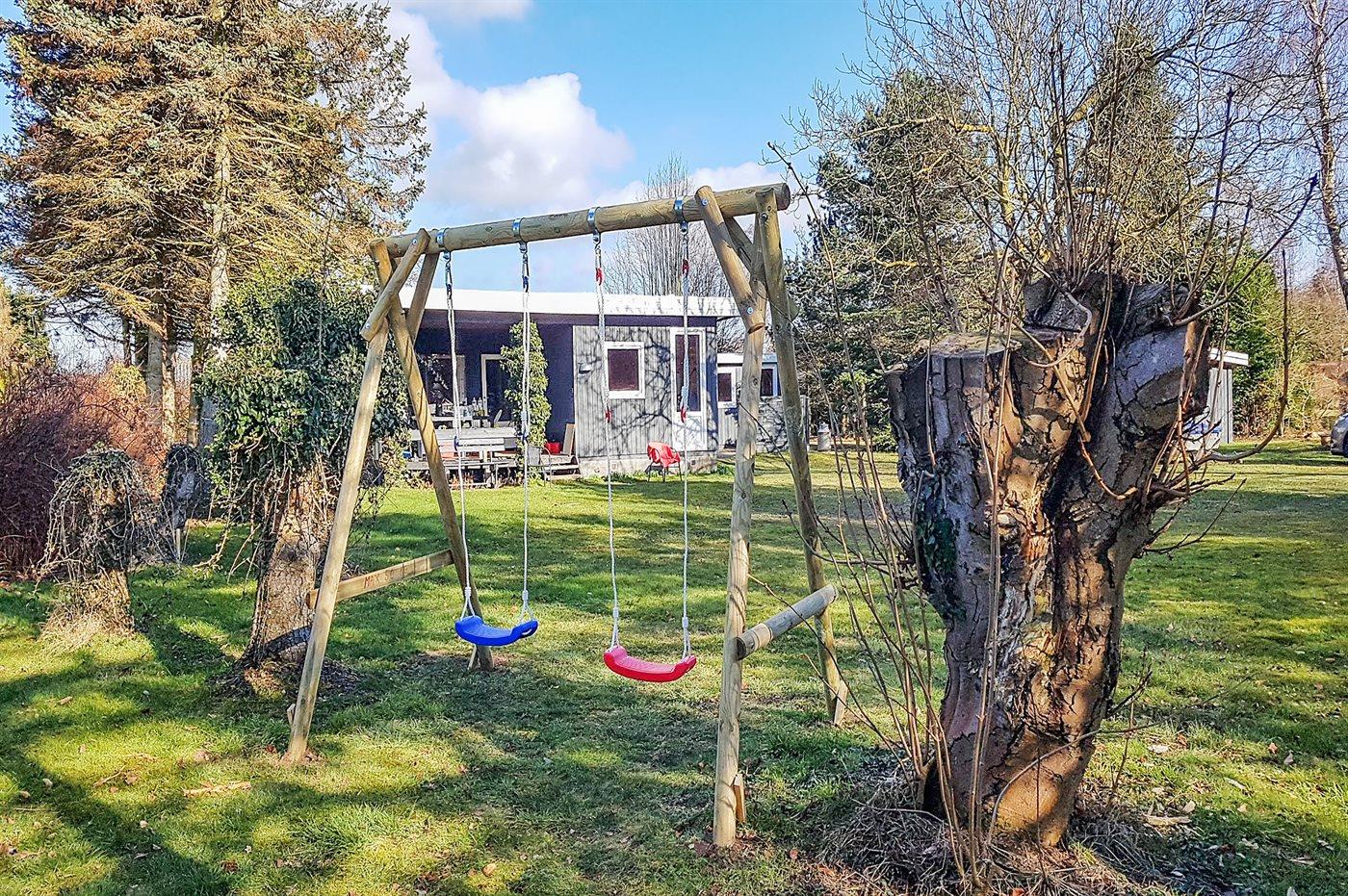 Dejligt sommerhus i roligt område tæt på børnevenlig badestrand og med stor, lukket grund omgivet af høje træer.