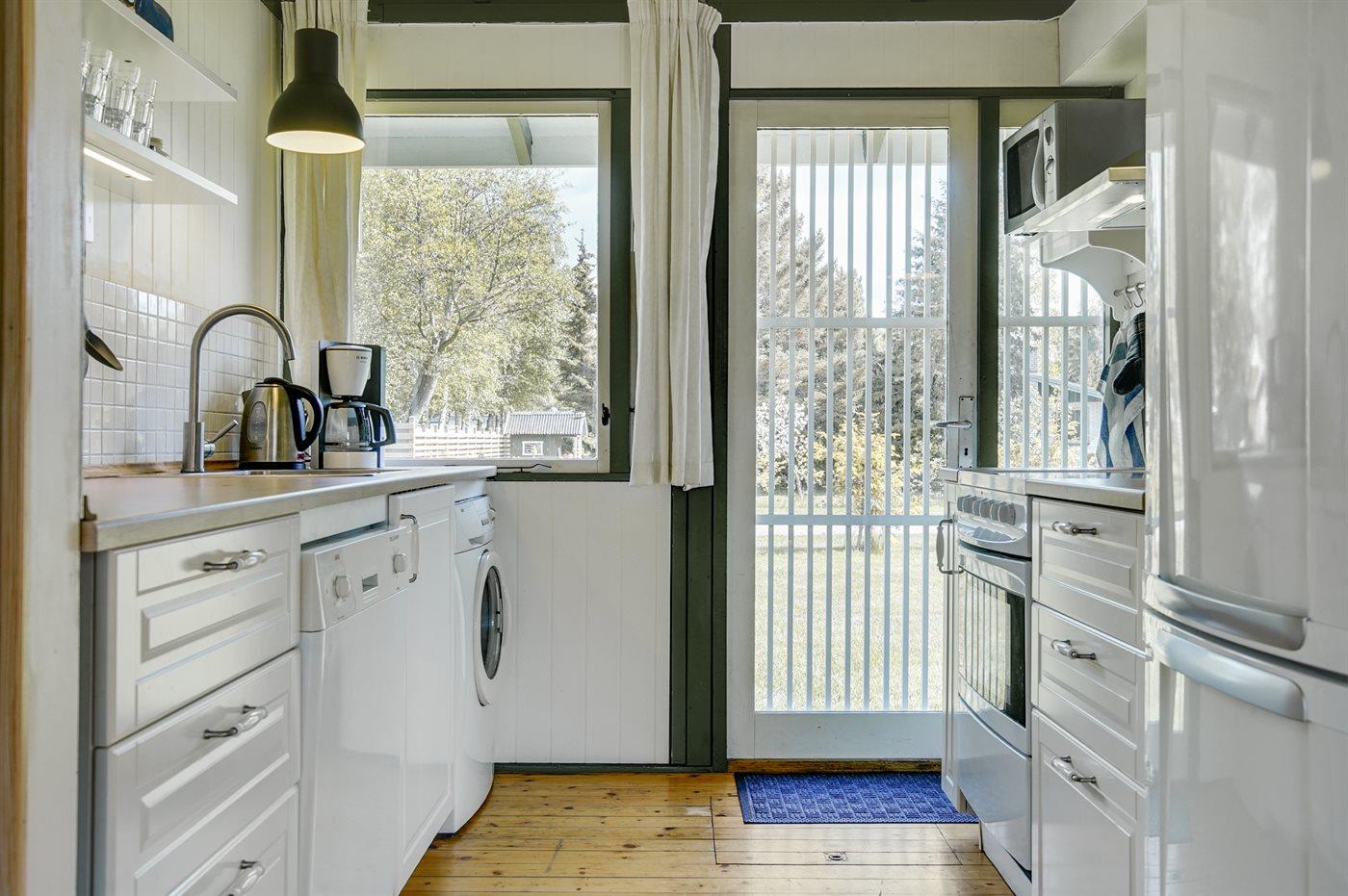 Køkkenet er udstyret med 1 køleskab. Der er 4 keramiske kogeplader, varmluftovn, mikrobølgeovn samt opvaskemaskine.