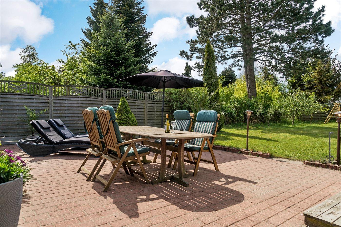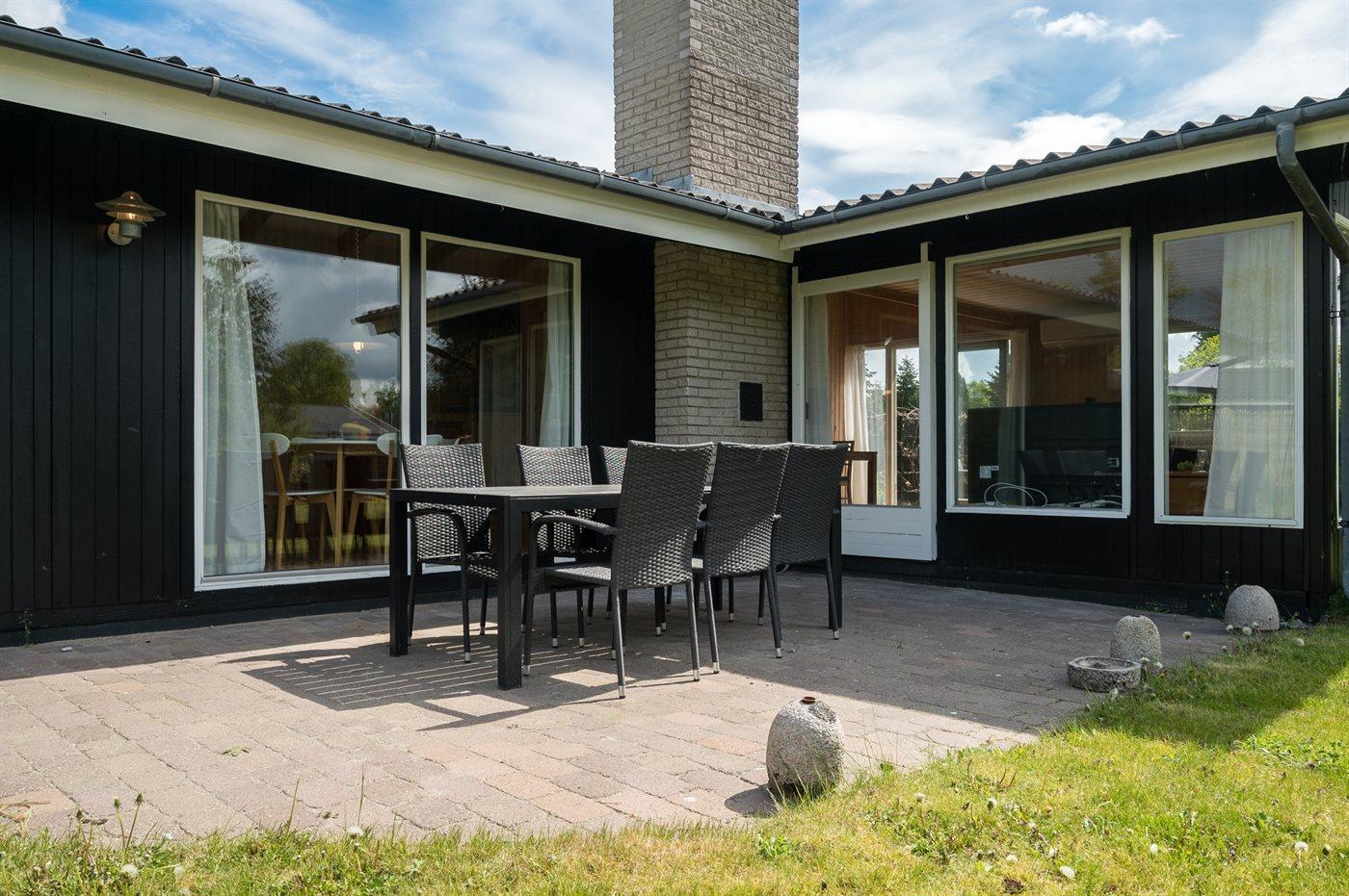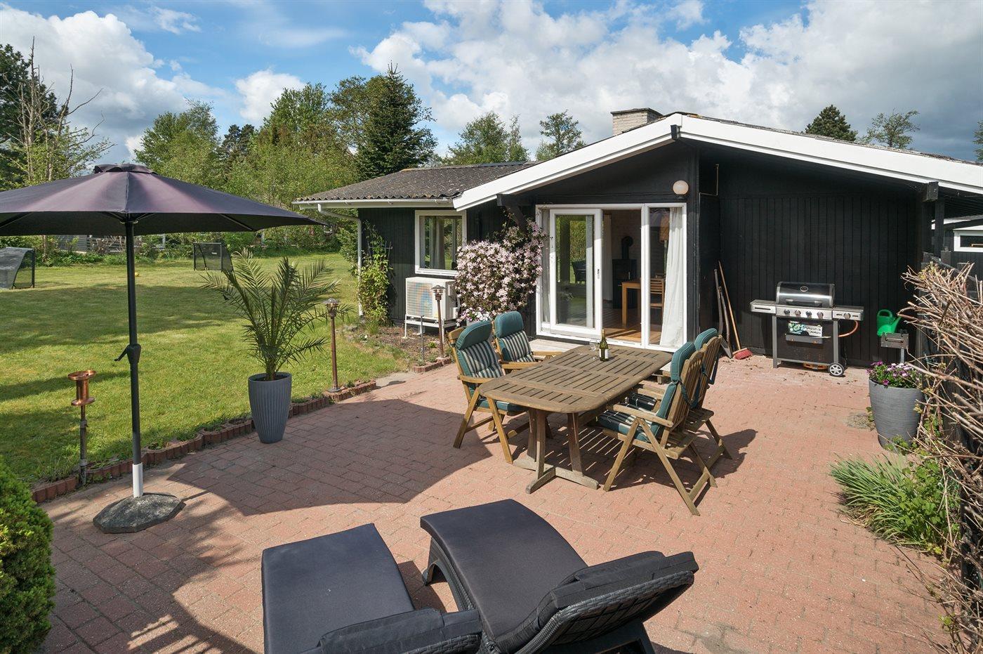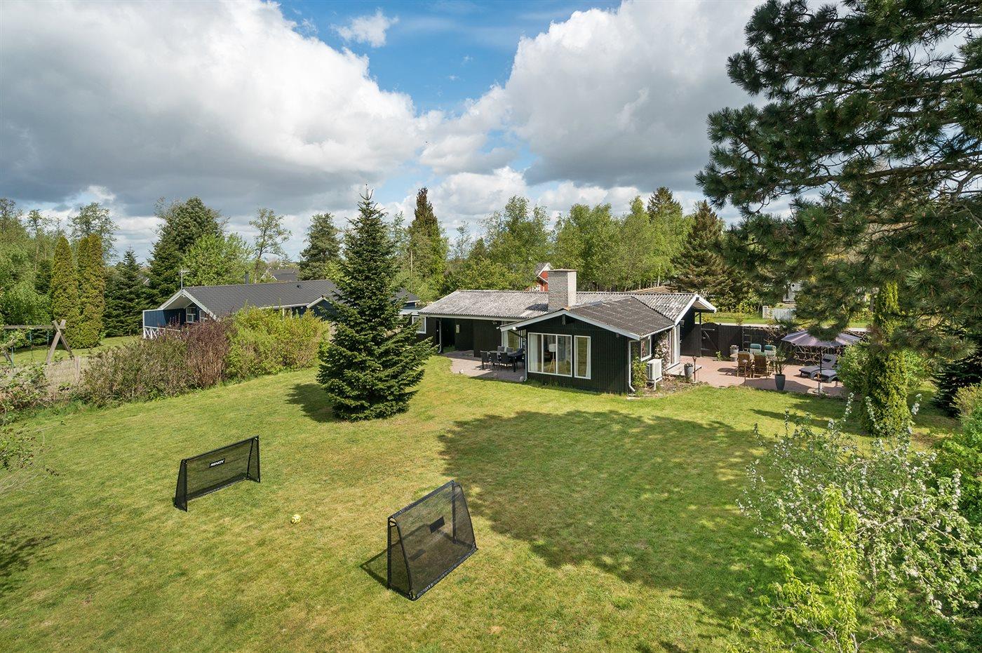 Ferieboligen er beliggende på en 1206 m² stor havegrund. Grunden er indhegnet. Der er 600 m til havet. Nærmeste forretning er beliggende i en afstand af 300 m. Der er en golfbane i en afstand af 1500 m. Til ferieboligen hører 70 m² terrasseareal. Gynge. Fodboldmål. Grill til rådighed. Der er installeret stik til opladning af elbil. Parkering ved ferieboligen.