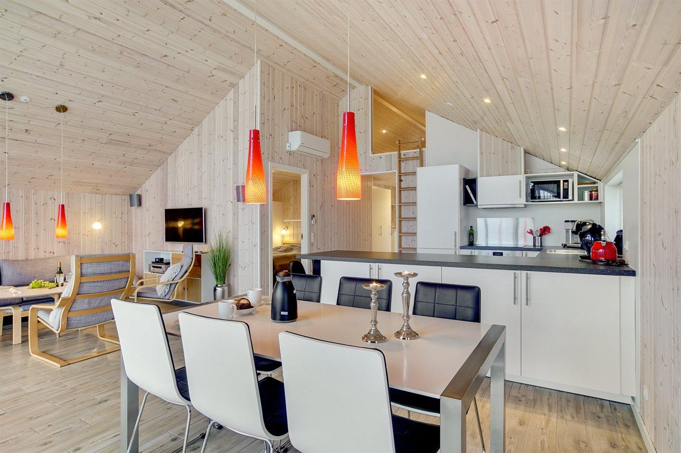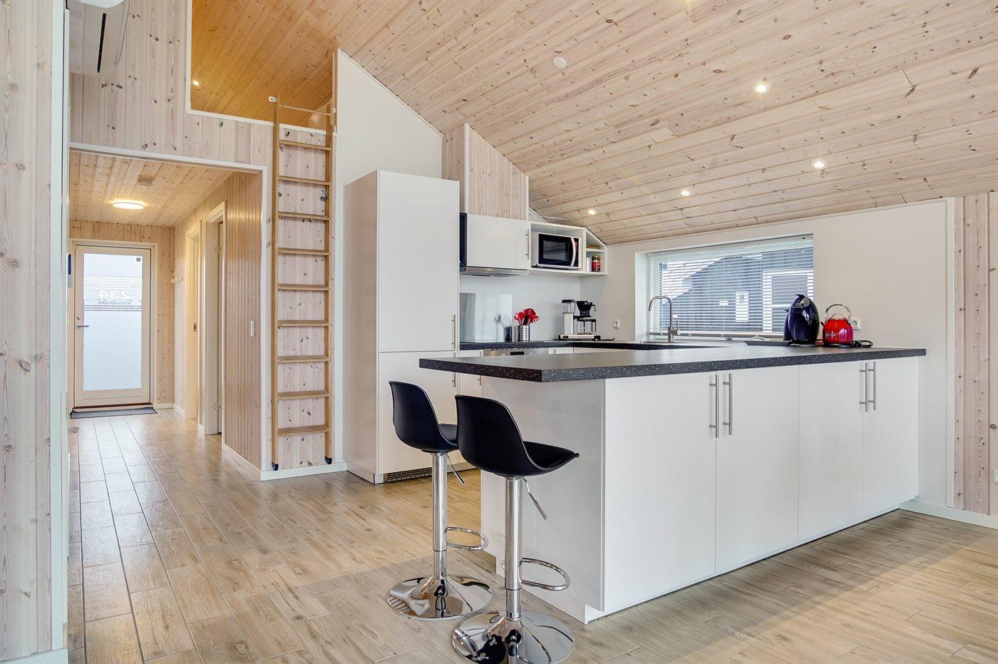 Køkkenet er udstyret med 1 køleskab. Der er 4 keramiske kogeplader, varmluftovn, mikrobølgeovn samt opvaskemaskine.
