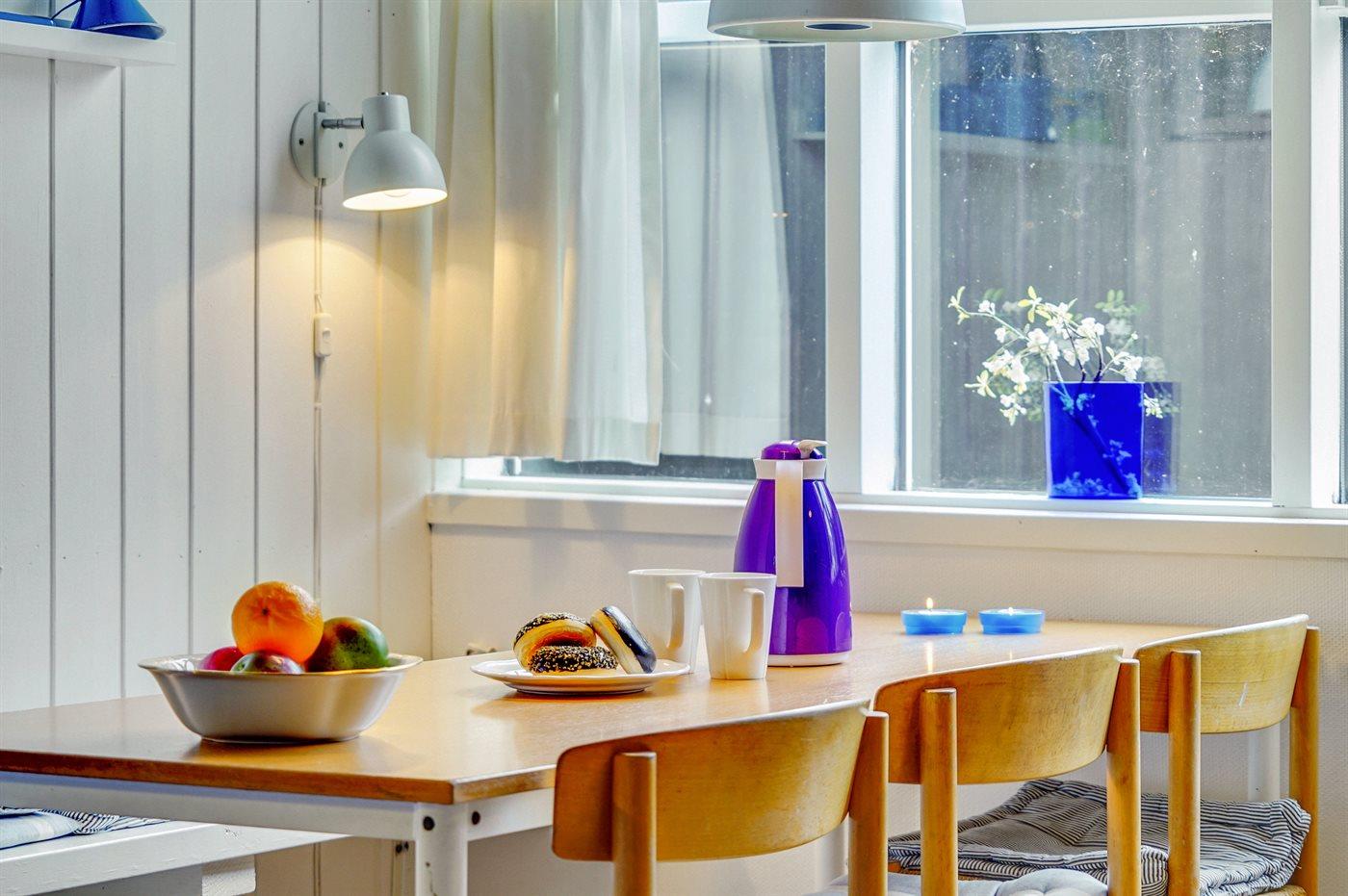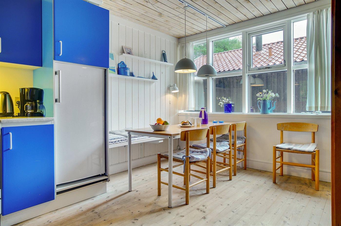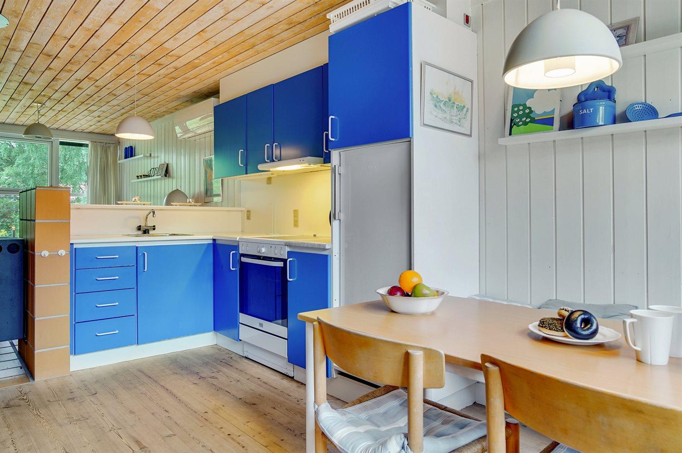 Køkkenet er udstyret med 1 køleskab. Der er 4 keramiske kogeplader, varmluftovn.
