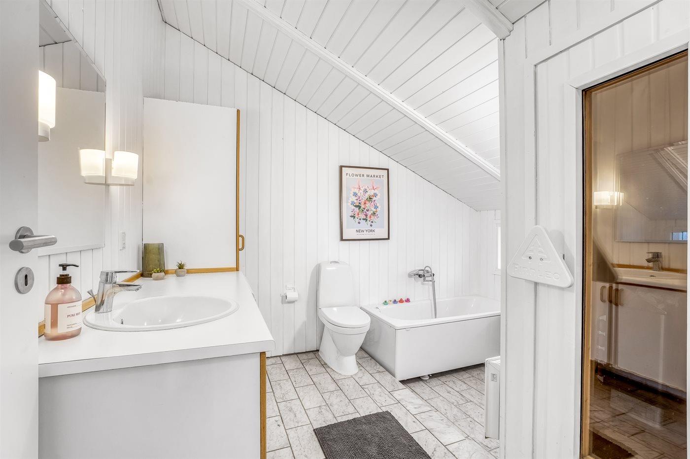 Der er 1 badeværelse med bruseniche og 2 toiletter, heraf 1 gæstetoilet. Der er gulvvarme på 1 badeværelse.. Badekar. I saunaen er der mulighed for afslapning.