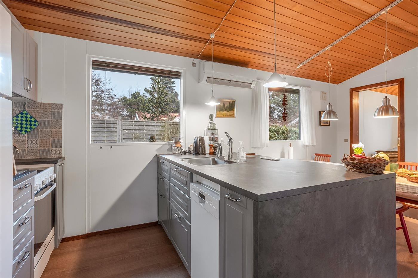 Køkkenet er udstyret med 1 køleskab. Der er 4 keramiske kogeplader, varmluftovn, mikrobølgeovn samt opvaskemaskine.