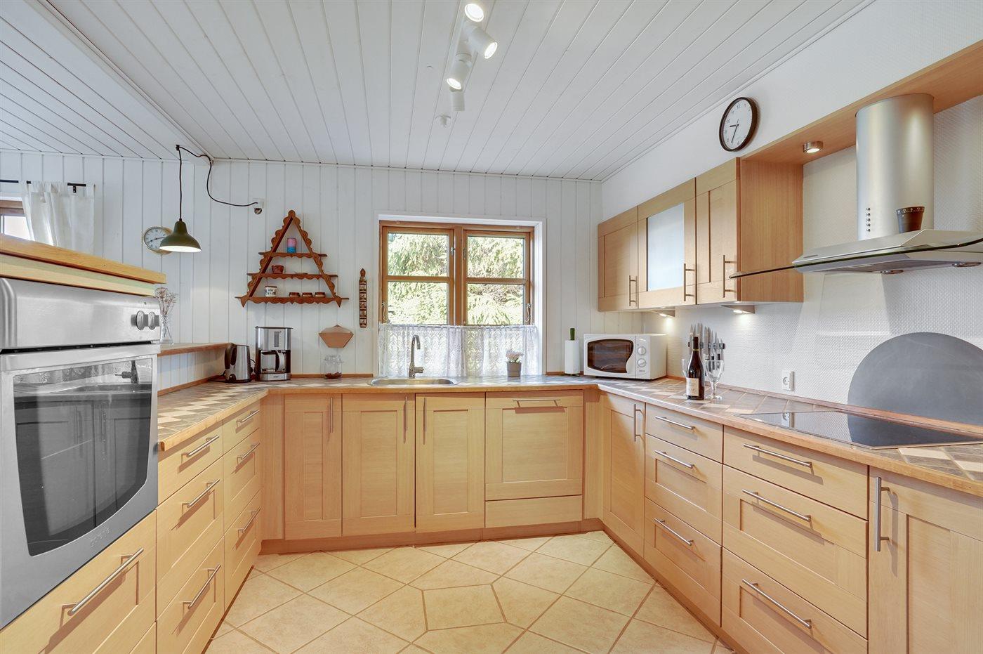 Køkkenet er udstyret med 1 køleskab. Der er 4 keramiske kogeplader, varmluftovn, mikrobølgeovn samt opvaskemaskine.