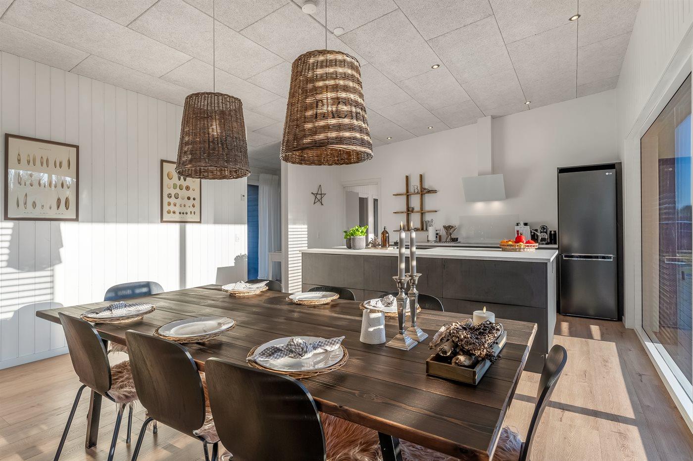 Køkkenet er lyst, moderne og særdeles veludstyret, så der er god mulighed for at tilberede lækre feriemåltider. Her finder I blandt andet køleskab med fryser, induktionskomfur, varmluftsovn, opvaskemaskine, mikrobølgeovn, kaffemaskine samt Nespresso-maskine med mælkeskummer – og selvfølgelig også brødrister og håndmixer.