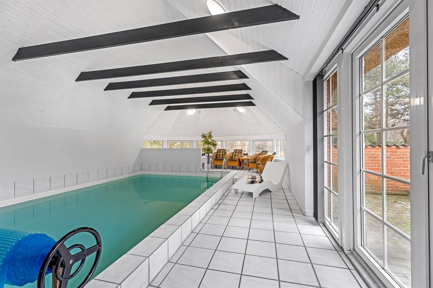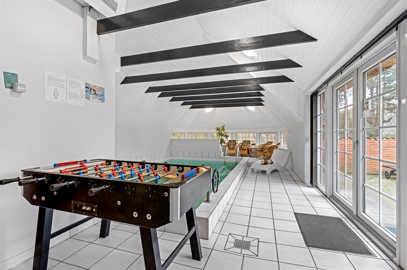 Dejligt sommerhus beliggende på en stor grund, omgivet af træer ligger dette flotte poolhus med bl.a. også sauna, spabad og bordfodbold.