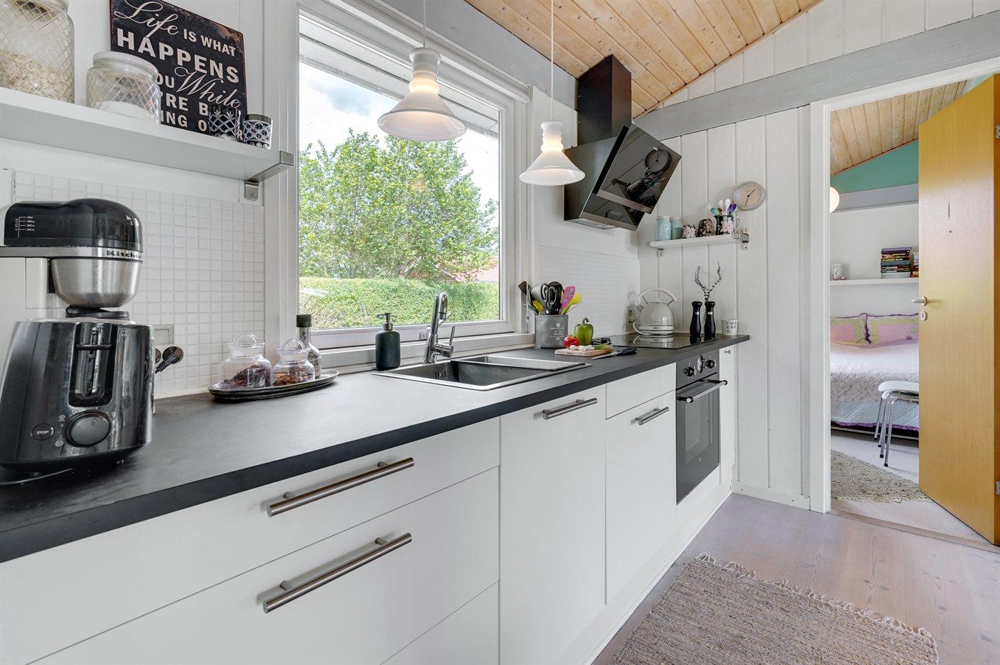 Køkkenet er udstyret med 1 køleskab. Der er 4 keramiske kogeplader, varmluftovn, mikrobølgeovn.