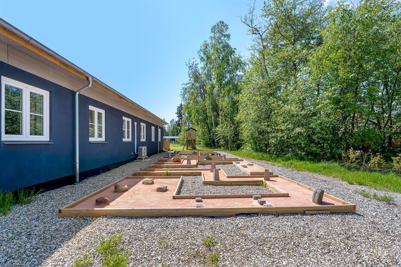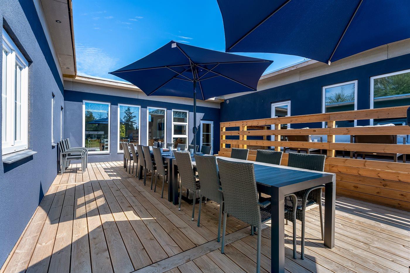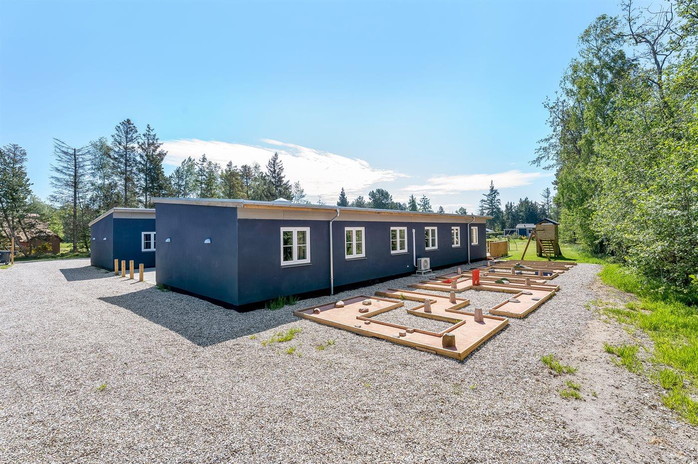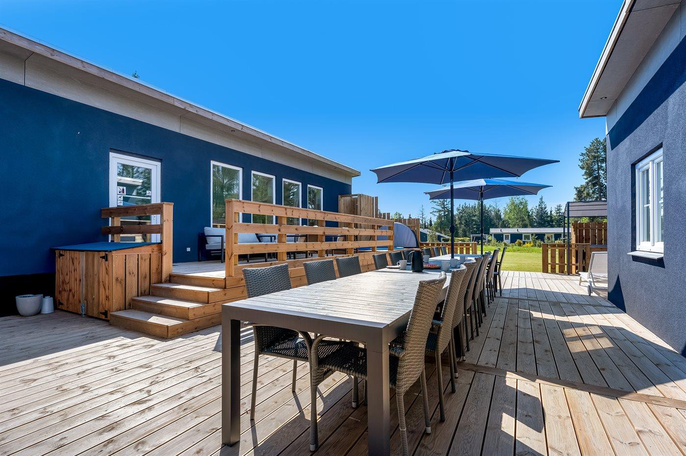 Udendørs. Der en 140 m2 stor træterrasse, der forbinder huset, poolhuset og haven. På terrassen er der et langt bord til 22 personer, der er loungemøbler, et nedbygget vildmarkskar som bliver fyldt med vand inde fra poolen, herefter starter en varmepumpe og varmer vandet op til 38 grader. Endvidere findes der en stor, dejlig grill på terrassen. Bag ved huset finder man en 9-huls minigolfbane. Der er desuden en stor, dejlig græsplæne med mulighed for forskellige boldspil, og et legeområde for mindre børn.