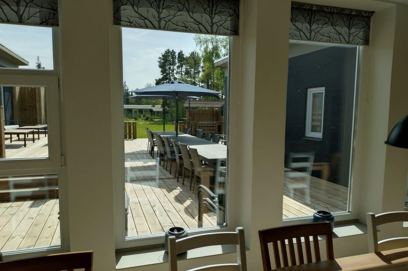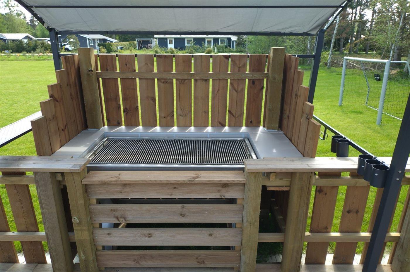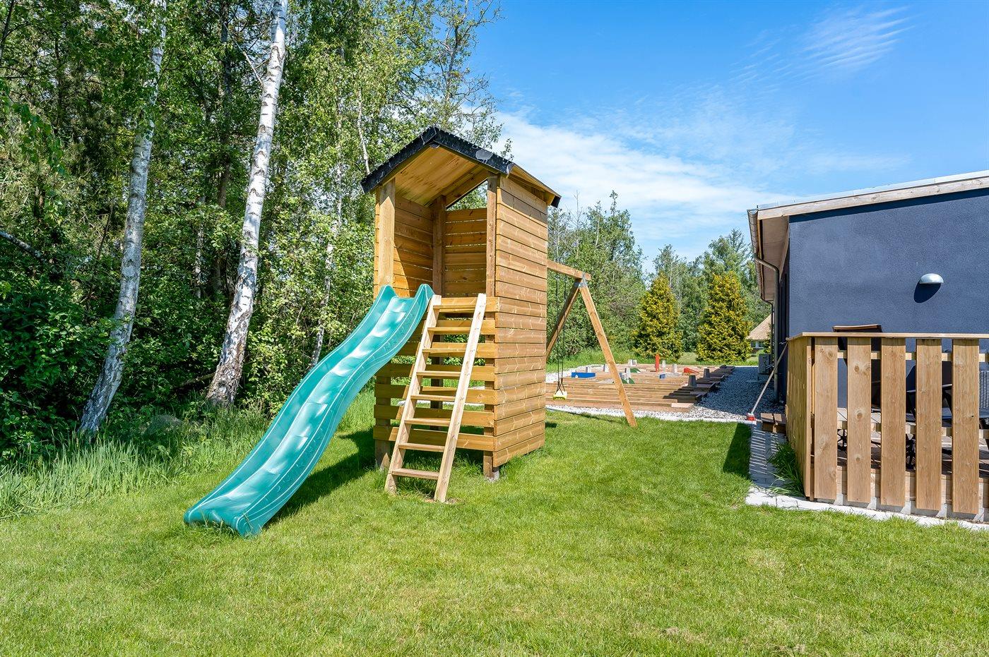 Udendørs. Der en 140 m2 stor træterrasse, der forbinder huset, poolhuset og haven. På terrassen er der et langt bord til 22 personer, der er loungemøbler, et nedbygget vildmarkskar som bliver fyldt med vand inde fra poolen, herefter starter en varmepumpe og varmer vandet op til 38 grader. Endvidere findes der en stor, dejlig grill på terrassen. Bag ved huset finder man en 9-huls minigolfbane. Der er desuden en stor, dejlig græsplæne med mulighed for forskellige boldspil, og et legeområde for mindre børn.
